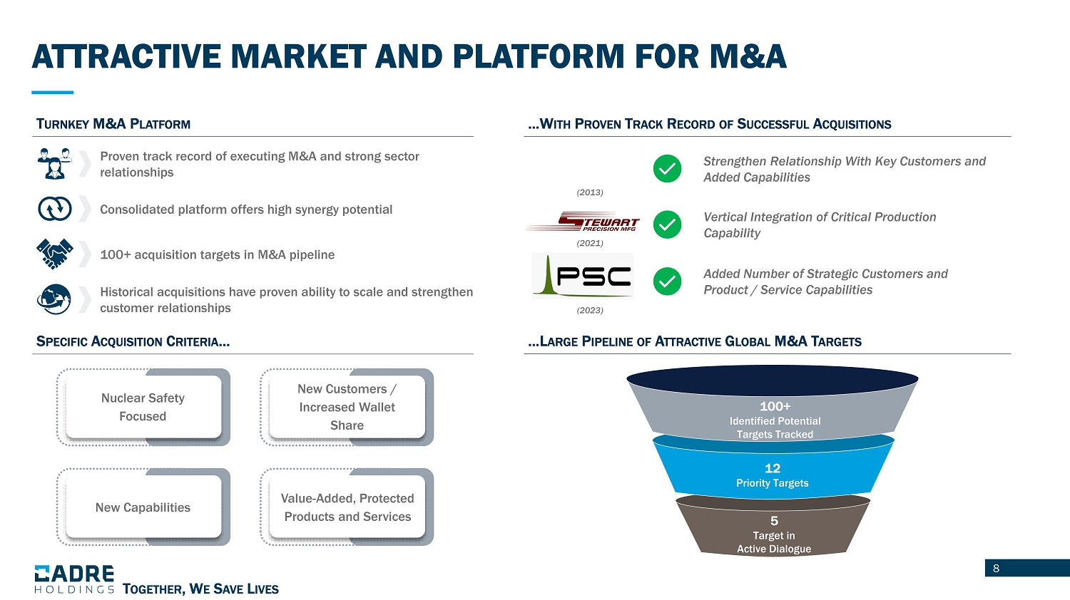 7 7 Source: Internal Company forecasts T OGETHER , W E S AVE L IVES MACROECONOMIC ENVIRONMENT SUPPORTS NUCLEAR SECTOR The nuclear sector offers multiple lucrative opportunities driven by enduring demand growth, supported by long - term federal directives and commercial initiatives “The U.S. hasn't manufactured pits regularly since 1989. The National Nuclear Security Administration has been directed to develop the capacity to make at least 80 pits a year by 2030 ” – U.S. Government Accountability Office January 2023 “The Civil Nuclear Credit Program is a $6 billion strategic investment through the Bipartisan Infrastructure Law (BIL) to help preserve the existing U.S. reactor fleet ” – U.S. Department of Energy: Civil Nuclear Credit Program “It is clear that nuclear is one of the lowest emitting sources of power . Nuclear power emits just 10 - 15g/CO2 equivalent per kWh, which is competitive with both wind and solar and substantially better than coal and natural gas. Nuclear power is also the second largest source of low carbon energy after hydro power, more than wind and solar combined ” – Schroders | Nuclear Power: A Viable Option in an Energy Transition August 2023 “DOE’s environmental and disposal liabilities also include the estimated cleanup…for a period of 75 years after the balance sheet date, i.e., through 2097 in FY 2022 and through 2096 in FY 2021 . While some post - cleanup monitoring and other long - term stewardship activities post - 2097 ” – Bureau of Fiscal Service “With today’s passage of the bipartisan ADVANCE Act , we are one step closer to reestablishing America’s preeminence as the global leader in nuclear energy in the twenty - first century” – Senate Passes Bipartisan Nuclear Energy Bill from Capito, Carper, Whitehouse July 2023