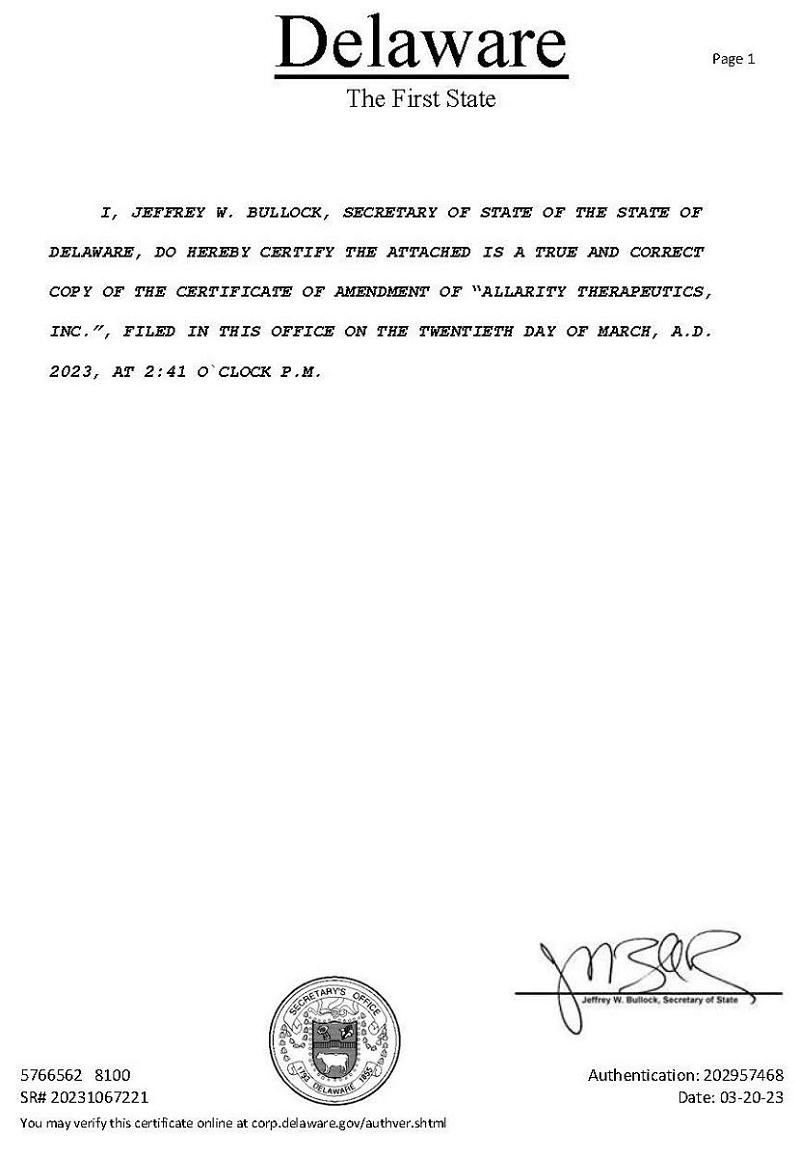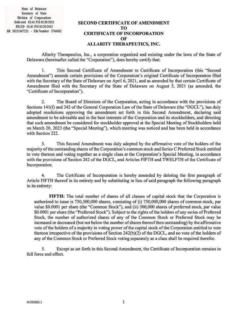 EX-3.1 2 ea175532-8kex3i_allarity.htm SECOND CERTIFICATE OF AMENDMENT OF CERTIFICATE OF INCORPORATION