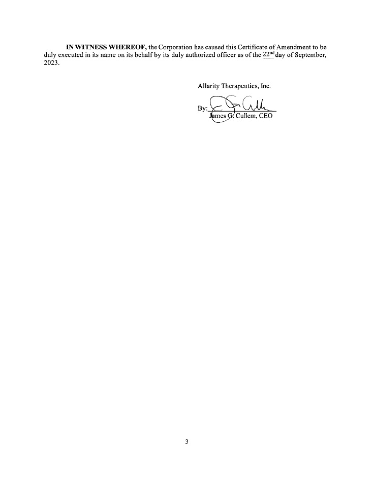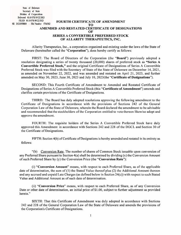 EX-3.1 2 ea185840ex3-1_allaritythera.htm FOURTH CERTIFICATE OF AMENDMENT (SERIES A PREFERRED STOCK)