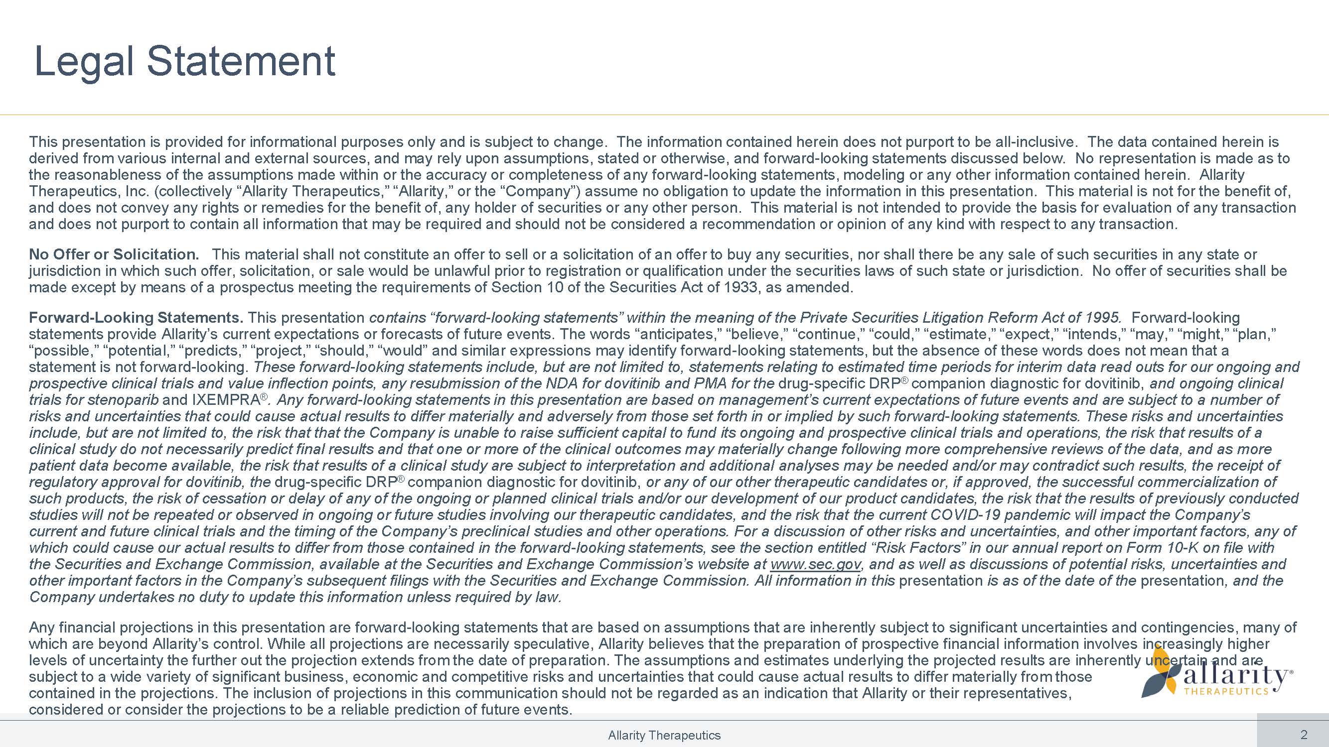 2 Allarity Therapeutics Legal Statement This presentation is provided for informational purposes only and is subject to change. The information contained herein does not purport to be all - inclusive. The data contained herein is derived from various internal and external sources, and may rely upon assumptions, stated or otherwise, and forward - looking statements discussed below. No representation is made as to the reasonableness of the assumptions made within or the accuracy or completeness of any forward - looking statements, modeling or any other information contained herein. Allarity Therapeutics, Inc. (collectively “Allarity Therapeutics,” “Allarity,” or the “Company”) assume no obligation to update the information in this presentation. This material is not for the benefit of, and does not convey any rights or remedies for the benefit of, any holder of securities or any other person. This material is not intended to provide the basis for evaluation of any transaction and does not purport to contain all information that may be required and should not be considered a recommendation or opinion of any kind with respect to any transaction. No Offer or Solicitation. This material shall not constitute an offer to sell or a solicitation of an offer to buy any securities, nor shall there be any sale of such securities in any state or jurisdiction in which such offer, solicitation, or sale would be unlawful prior to registration or qualification under the securities laws of such state or jurisdiction. No offer of securities shall be made except by means of a prospectus meeting the requirements of Section 10 of the Securities Act of 1933, as amended. Forward - Looking Statements. This presentation contains “forward - looking statements” within the meaning of the Private Securities Litigation Reform Act of 1995. Forward - looking statements provide Allarity’s current expectations or forecasts of future events. The words “anticipates,” “believe,” “continue,” “could,” “estimate,” “expect,” “intends,” “may,” “might,” “plan,” “possible,” “potential,” “predicts,” “project,” “should,” “would” and similar expressions may identify forward - looking statements, but the absence of these words does not mean that a statement is not forward - looking. These forward - looking statements include, but are not limited to, statements relating to estimated time periods for interim data read outs for our ongoing and prospective clinical trials and value inflection points, any resubmission of the NDA for dovitinib and PMA for the drug - specific DRP ® companion diagnostic for dovitinib, and ongoing clinical trials for stenoparib and IXEMPRA ® . Any forward - looking statements in this presentation are based on management’s current expectations of future events and are subject to a number of risks and uncertainties that could cause actual results to differ materially and adversely from those set forth in or implied by such forward - looking statements. These risks and uncertainties include, but are not limited to, the risk that that the Company is unable to raise sufficient capital to fund its ongoing and prospective clinical trials and operations, the risk that results of a clinical study do not necessarily predict final results and that one or more of the clinical outcomes may materially change following more comprehensive reviews of the data, and as more patient data become available, the risk that results of a clinical study are subject to interpretation and additional analyses may be needed and/or may contradict such results, the receipt of regulatory approval for dovitinib, the drug - specific DRP ® companion diagnostic for dovitinib, or any of our other therapeutic candidates or, if approved, the successful commercialization of such products, the risk of cessation or delay of any of the ongoing or planned clinical trials and/or our development of our product candidates, the risk that the results of previously conducted studies will not be repeated or observed in ongoing or future studies involving our therapeutic candidates, and the risk that the current COVID - 19 pandemic will impact the Company’s current and future clinical trials and the timing of the Company’s preclinical studies and other operations. For a discussion of other risks and uncertainties, and other important factors, any of which could cause our actual results to differ from those contained in the forward - looking statements, see the section entitled “Risk Factors” in our annual report on Form 10 - K on file with the Securities and Exchange Commission, available at the Securities and Exchange Commission’s website at www.sec.gov , and as well as discussions of potential risks, uncertainties and other important factors in the Company’s subsequent filings with the Securities and Exchange Commission. All information in this presentation is as of the date of the presentation , and the Company undertakes no duty to update this information unless required by law. Any financial projections in this presentation are forward - looking statements that are based on assumptions that are inherently subject to significant uncertainties and contingencies, many of which are beyond Allarity’s control. While all projections are necessarily speculative, Allarity believes that the preparation of prospective financial information involves increasingly higher levels of uncertainty the further out the projection extends from the date of preparation. The assumptions and estimates underlying the projected results are inherently uncertain and are subject to a wide variety of significant business, economic and competitive risks and uncertainties that could cause actual results to differ materially from those contained in the projections. The inclusion of projections in this communication should not be regarded as an indication that Allarity or their representatives, co