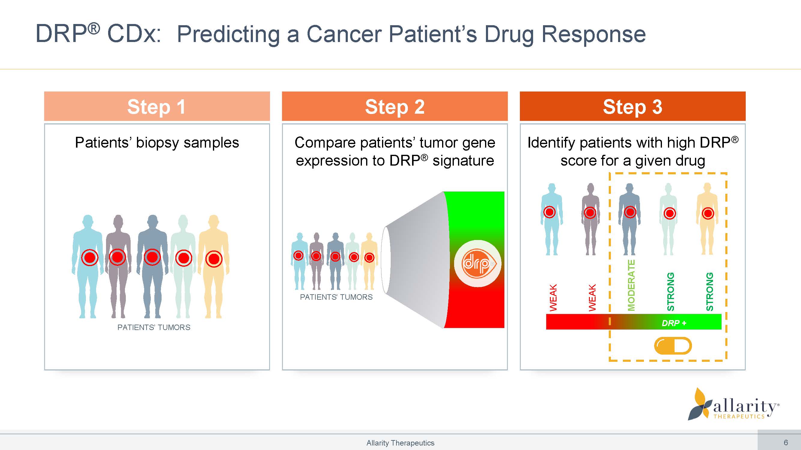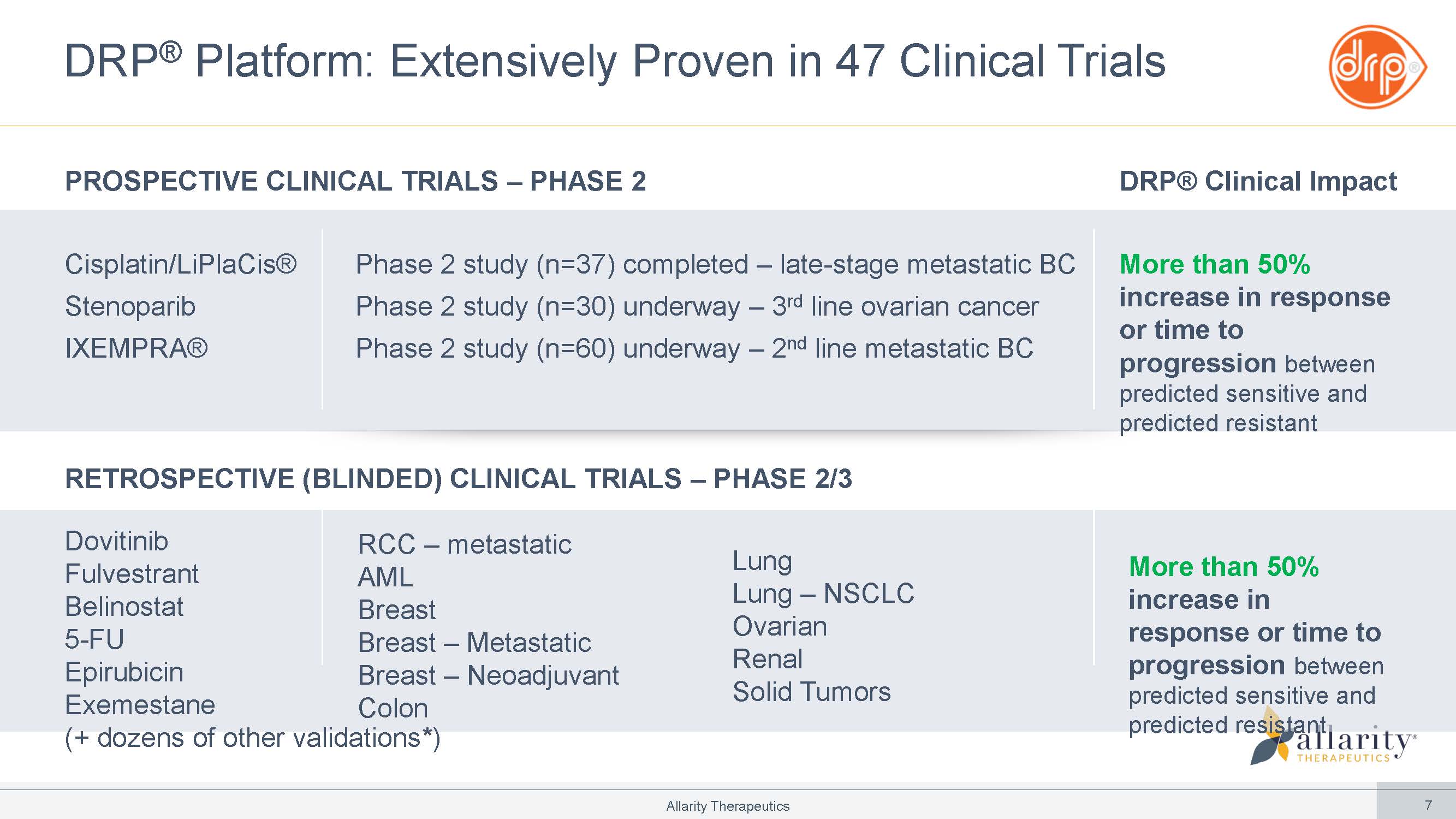 Compare patients’ tumor gene expression to DRP ® signature PATIENTS’ TUMORS DRP ® CDx: Predicting a Cancer Patient’s Drug Response STRONG WEAK Patients’ biopsy samples PATIENTS’ TUMORS Step 1 Step 2 Step 3 WEAK MODERATE STRONG Identify patients with high DRP ® score for a given drug DRP + Allarity Therapeutics 6