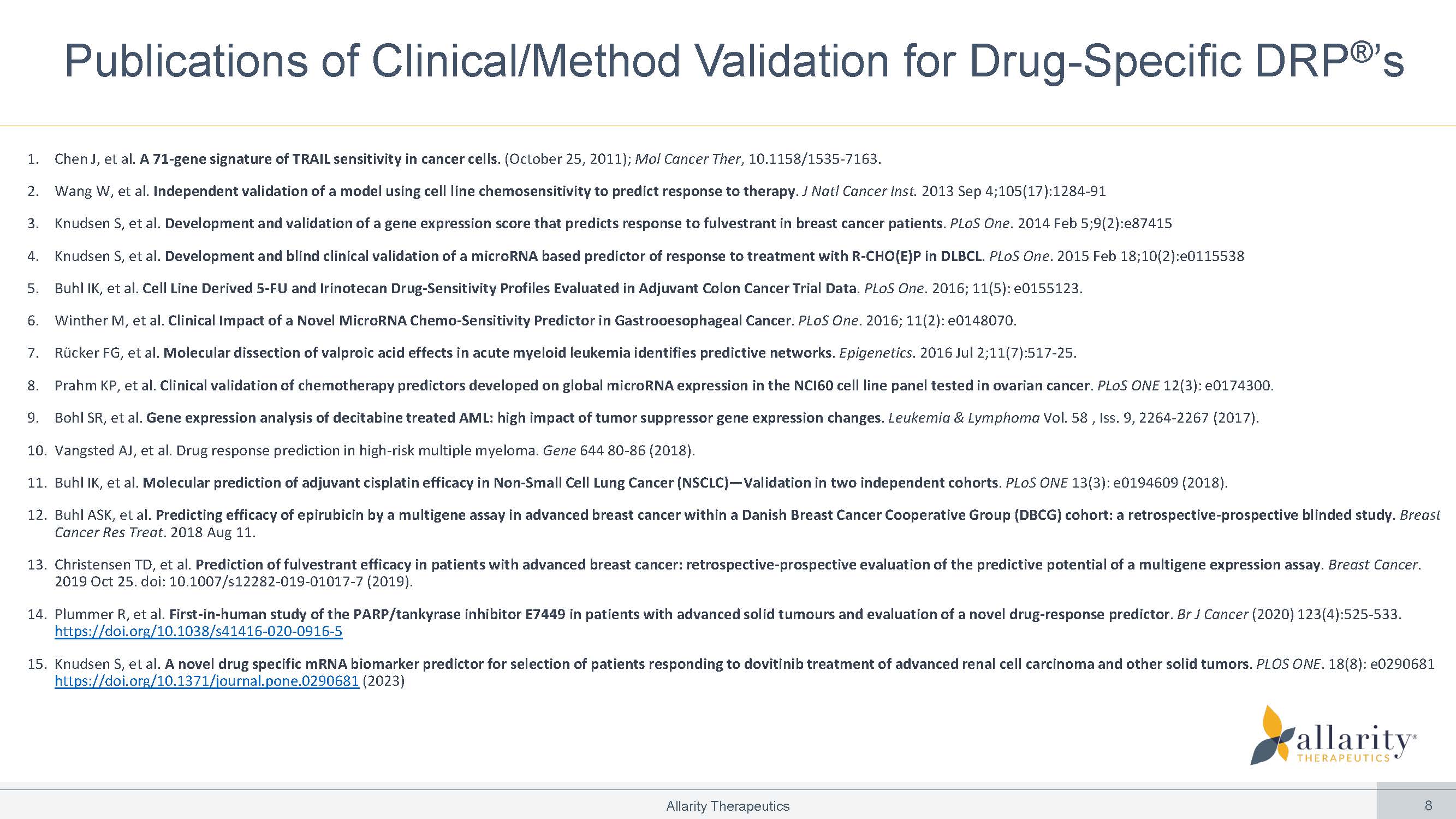 DRP ® Platform: Extensively Proven in 47 Clinical Trials Cisplatin/LiPlaCis® Stenoparib IXEMPRA® (+ dozens of other validations*) PROSPECTIVE CLINICAL TRIALS – PHASE 2 DRP® Clinical Impact More than 50% increase in response or time to progression between predicted sensitive and predicted resistant RETROSPECTIVE (BLINDED) CLINICAL TRIALS – PHASE 2/3 Allarity Therapeutics 7 More than 50% increase in response or time to progression between Lung Lung – NSCLC Ovarian Renal RCC – metastatic AML Breast Breast – Metastatic Dovitinib Fulvestrant Belinostat 5 - FU predicted sensitive and predicted resistant Solid Tumors Breast – Neoadjuvant Colon Epirubicin Exemestane Phase 2 study (n=37) completed – late - stage metastatic BC Phase 2 study (n=30) underway – 3 rd line ovarian cancer Phase 2 study (n=60) underway – 2 nd line metastatic BC