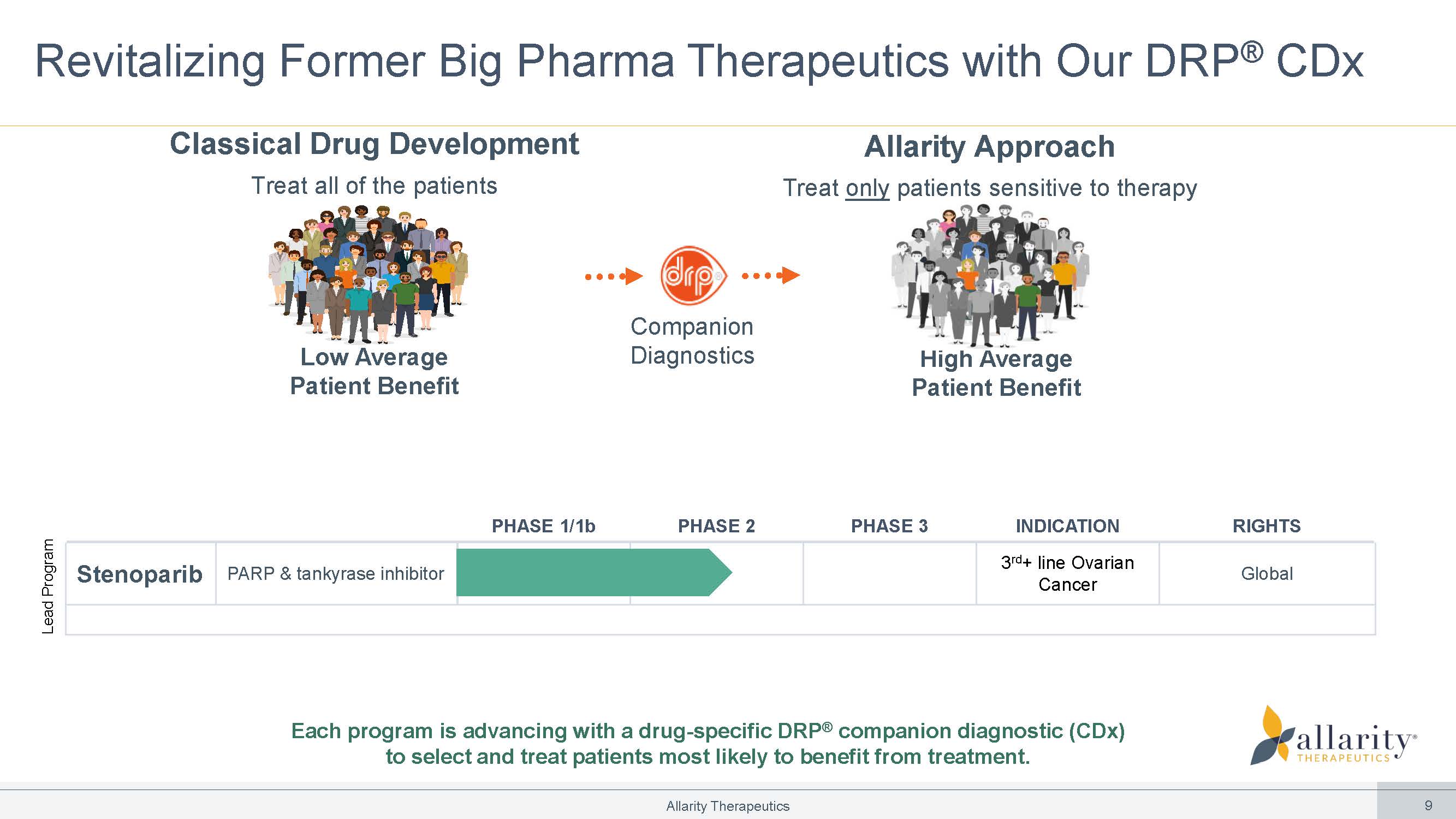 Revitalizing Former Big Pharma Therapeutics with Our DRP ® CDx Companion Diagnostics Low Average Patient Benefit High Average Patient Benefit Classical Drug Development Treat all of the patients Allarity Approach Treat only patients sensitive to therapy RIGHTS INDICATION PHASE 3 PHASE 2 PHASE 1/1b Global UG OLQH 2YDULDQ&DQFHU PARP & tankyrase inhibitor Stenoparib Lead Program Each program is advancing with a drug - specific DRP ® companion diagnostic (CDx) to select and treat patients most likely to benefit from treatment. Allarity Therapeutics 9