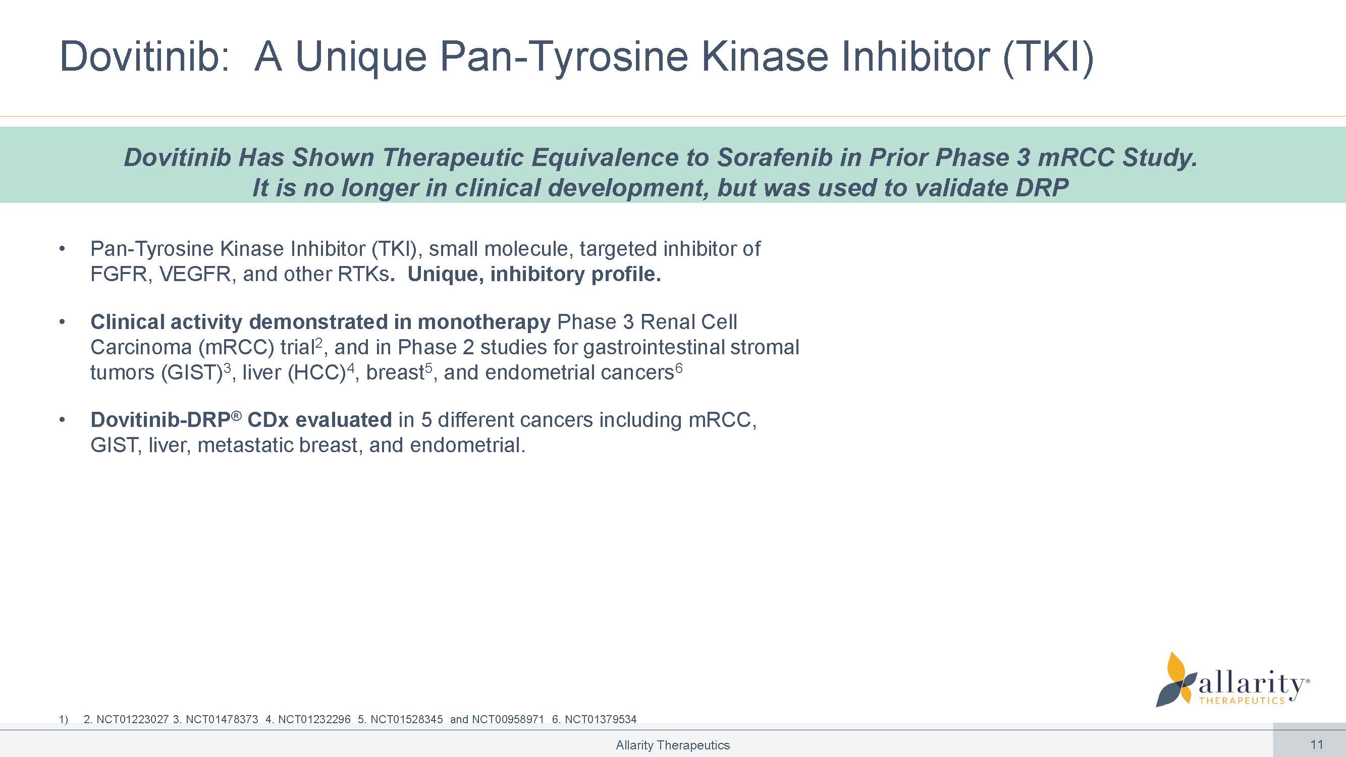 Dovitinib Has Shown Therapeutic Equivalence to Sorafenib in Prior Phase 3 mRCC Study. It is no longer in clinical development, but was used to validate DRP • Pan - Tyrosine Kinase Inhibitor (TKI), small molecule, targeted inhibitor of FGFR, VEGFR, and other RTKs . Unique, inhibitory profile. • Clinical activity demonstrated in monotherapy Phase 3 Renal Cell Carcinoma (mRCC) trial 2 , and in Phase 2 studies for gastrointestinal stromal tumors (GIST) 3 , liver (HCC) 4 , breast 5 , and endometrial cancers 6 • Dovitinib - DRP ® CDx evaluated in 5 different cancers including mRCC, GIST, liver, metastatic breast, and endometrial. Allarity Therapeutics 11 1) 2. NCT01223027 3. NCT01478373 4. NCT01232296 5. NCT01528345 and NCT00958971 6. NCT01379534 Dovitinib: A Unique Pan - Tyrosine Kinase Inhibitor (TKI)