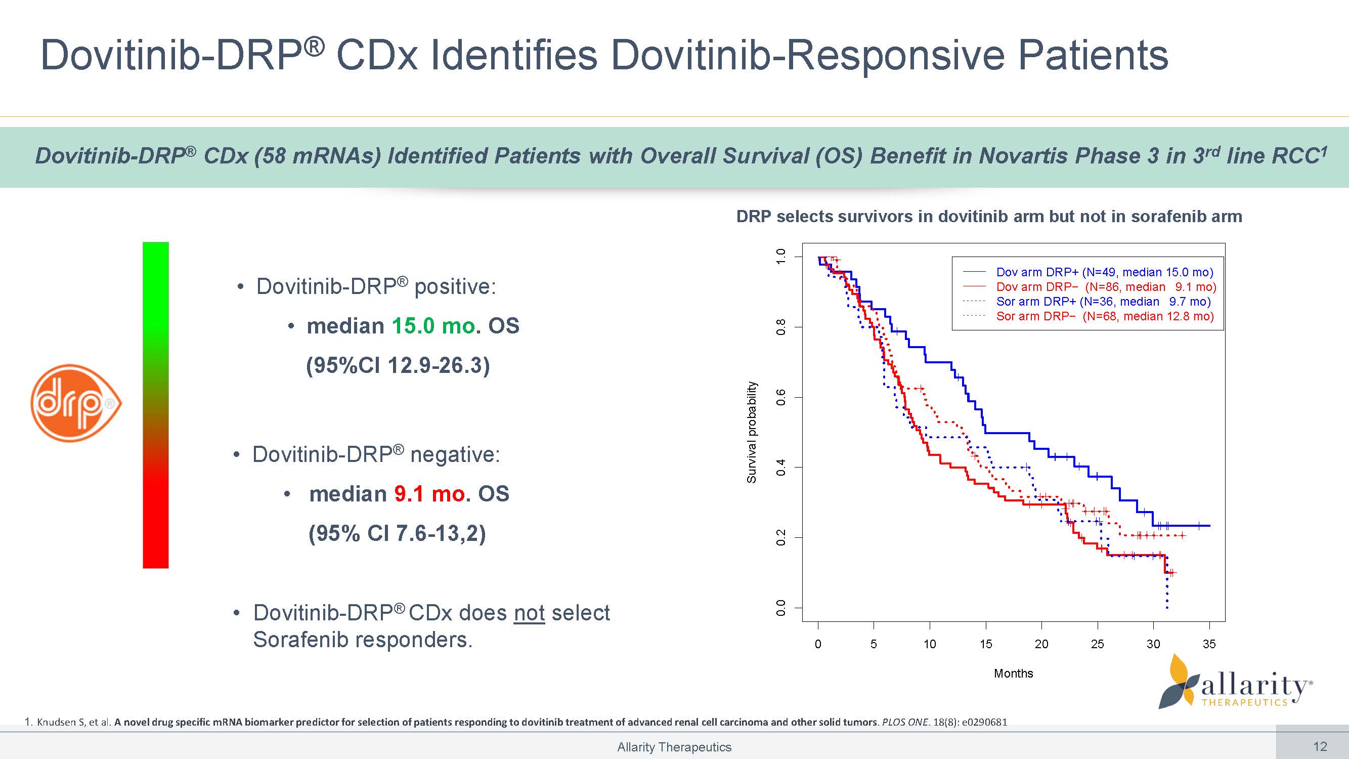 1. Knudsen S, et al. A novel drug specific mRNA biomarker predictor for selection of patients responding to dovitinib treatment of advanced renal cell carcinoma and other solid tumors . PLOS ONE . 18(8): e0290681 Dovitinib - DRP ® CDx Identifies Dovitinib - Responsive Patients Dovitinib - DRP ® CDx (58 mRNAs) Identified Patients with Overall Survival (OS) Benefit in Novartis Phase 3 in 3 rd line RCC 1 DRP selects survivors in dovitinib arm but not in sorafenib arm • Dovitinib - DRP ® positive: • median 15.0 mo . OS (95%CI 12.9 - 26.3) 0 5 10 15 20 25 30 35 0.0 0.2 0.4 0.6 0.8 1.0 Months Survival probability Dov arm DRP+ (N=49, median 15.0 mo) Dov arm DRP− (N=86, median 9.1 mo) Sor arm DRP+ (N=36, median 9.7 mo) Sor arm DRP− (N=68, median 12.8 mo) • Dovitinib - DRP ® negative: • median 9.1 mo . OS (95% CI 7.6 - 13,2) Allarity Therapeutics 12 • Dovitinib - DRP ® CDx does not select Sorafenib responders.