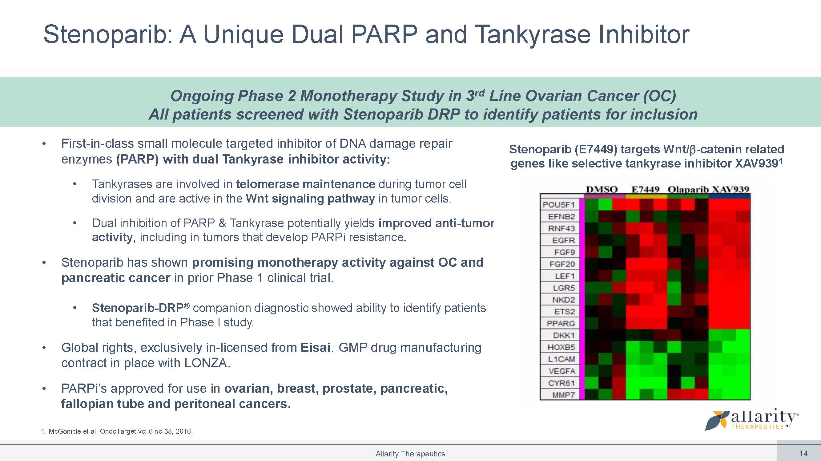 • First - in - class small molecule targeted inhibitor of DNA damage repair enzymes (PARP) with dual Tankyrase inhibitor activity: • Tankyrases are involved in telomerase maintenance during tumor cell division and are active in the Wnt signaling pathway in tumor cells. • Dual inhibition of PARP & Tankyrase potentially yields improved anti - tumor activity , including in tumors that develop PARPi resistance . • Stenoparib has shown promising monotherapy activity against OC and pancreatic cancer in prior Phase 1 clinical trial. • Stenoparib - DRP ® companion diagnostic showed ability to identify patients that benefited in Phase I study. • Global rights, exclusively in - licensed from Eisai . GMP drug manufacturing contract in place with LONZA. • PARPi’s approved for use in ovarian, breast, prostate, pancreatic, fallopian tube and peritoneal cancers. 1. McGonicle et al, OncoTarget vol 6 no 38, 2016. Stenoparib: A Unique Dual PARP and Tankyrase Inhibitor Ongoing Phase 2 Monotherapy Study in 3 rd Line Ovarian Cancer (OC) All patients screened with Stenoparib DRP to identify patients for inclusion Stenoparib (E7449) targets Wnt/ - catenin related genes like selective tankyrase inhibitor XAV939 1 0 2.000 4.000 6.000 8.000 10.000 12.000 2019A 2026E Ovarian cancer Pancreatic cancer Allarity Therapeutics 14