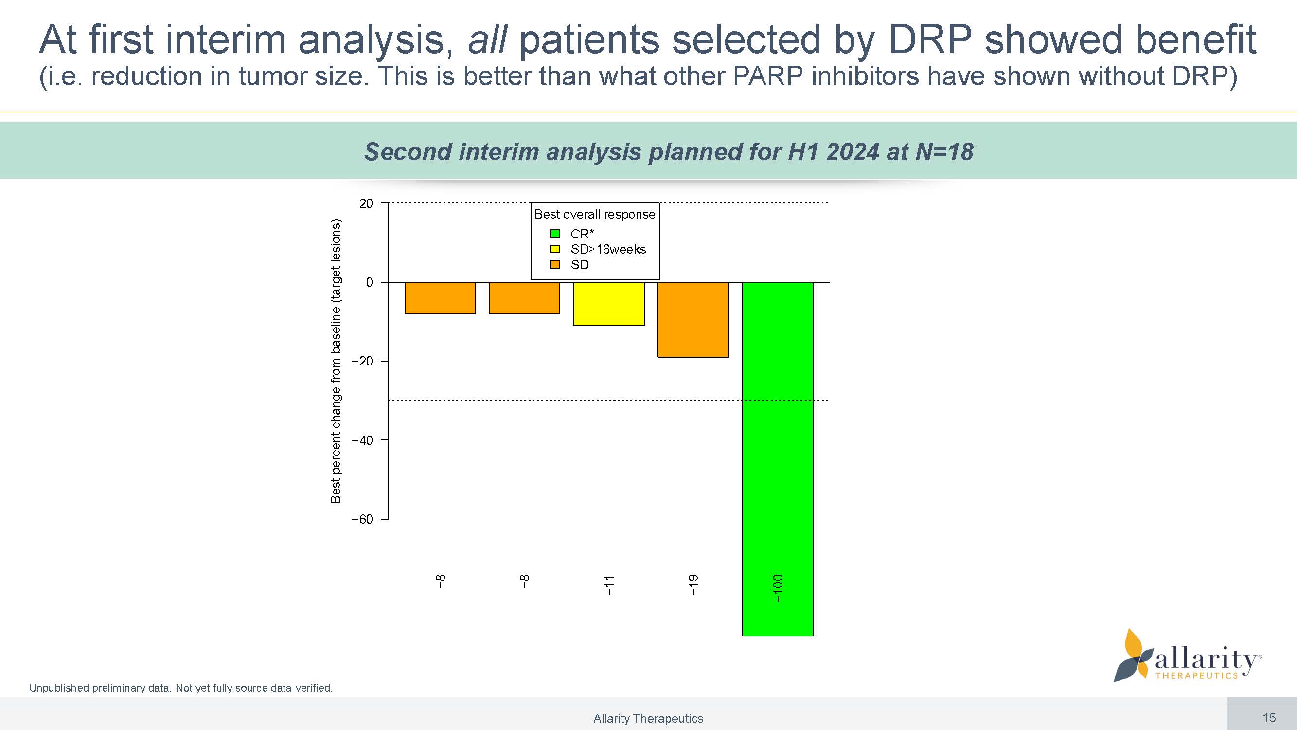 Unpublished preliminary data. Not yet fully source data verified. At first interim analysis, all patients selected by DRP showed benefit (i.e. reduction in tumor size. This is better than what other PARP inhibitors have shown without DRP) −8 −8 −11 −19 −100 Best percent change from baseline (target lesions) −60 −40 −20 0 20 Best overall response CR* SD>16weeks SD Second interim analysis planned for H1 2024 at N=18 Allarity Therapeutics 15