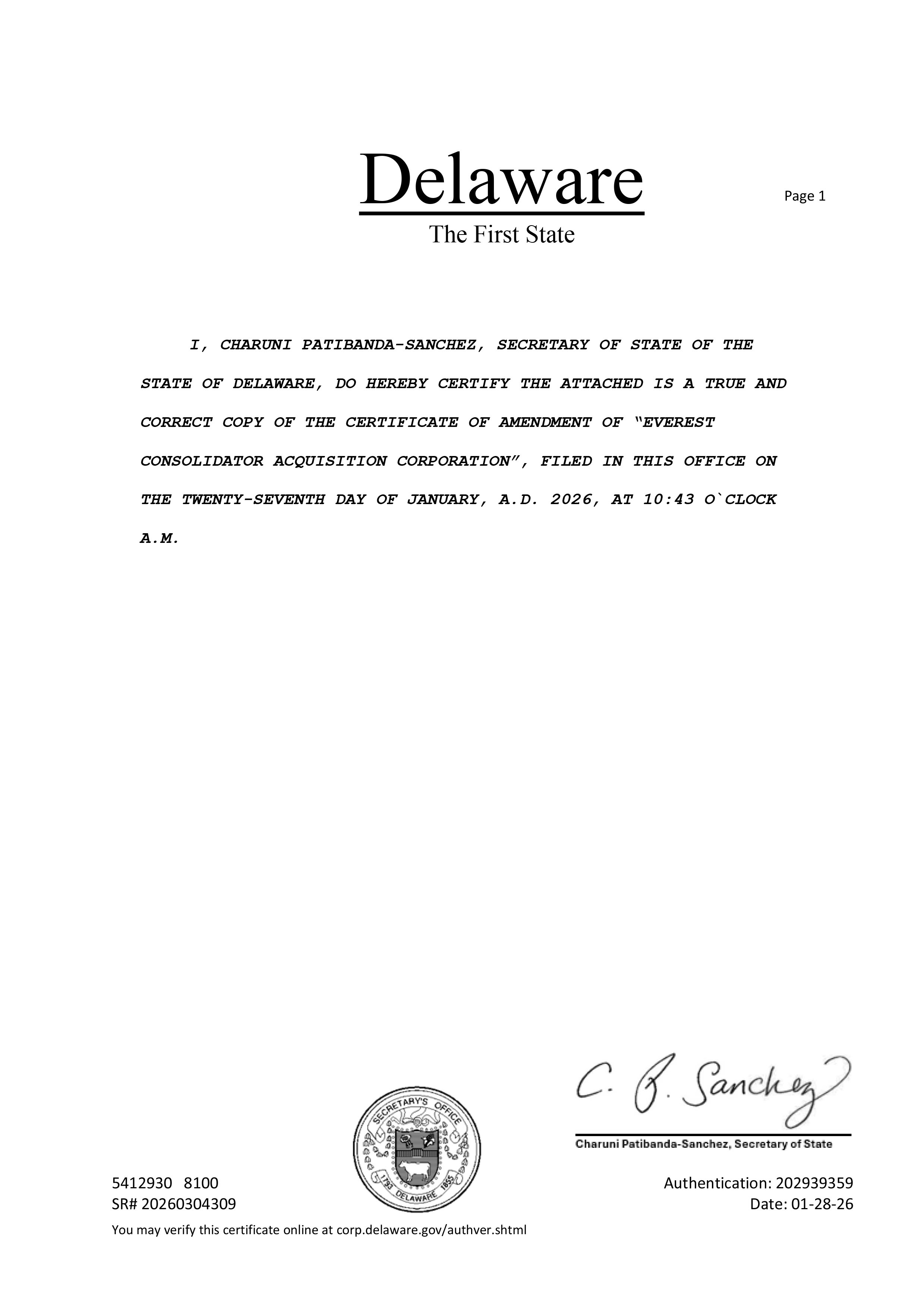 Delaware The First State Page 1 I, CHARUNI PATIBANDA-SANCHEZ, SECRETARY OF STATE OF THE STATE OF DELAWARE, DO HEREBY CERTIFY THE ATTACHED IS A TRUE AND CORRECT COPY OF THE CERTIFICATE OF AMENDMENT OF “EVEREST CONSOLIDATOR ACQUISITION CORPORATION”, FILED IN THIS OFFICE ON THE TWENTY-SEVENTH DAY OF JANUARY, A.D. 2026, AT 10:43 O`CLOCK A.M. 5412930 8100Authentication: 202939359 SR# 20260304309Date: 01-28-26 You may verify this certificate online at corp.delaware.gov/authver.shtml Sta te of Delaware Secretary of State Division of Corpora tions Delinred 10:43 A:VI 01127f2026 FILED 10:43 AM 01t27f2026 SR 20260304309 - FiieNu mber 5412930