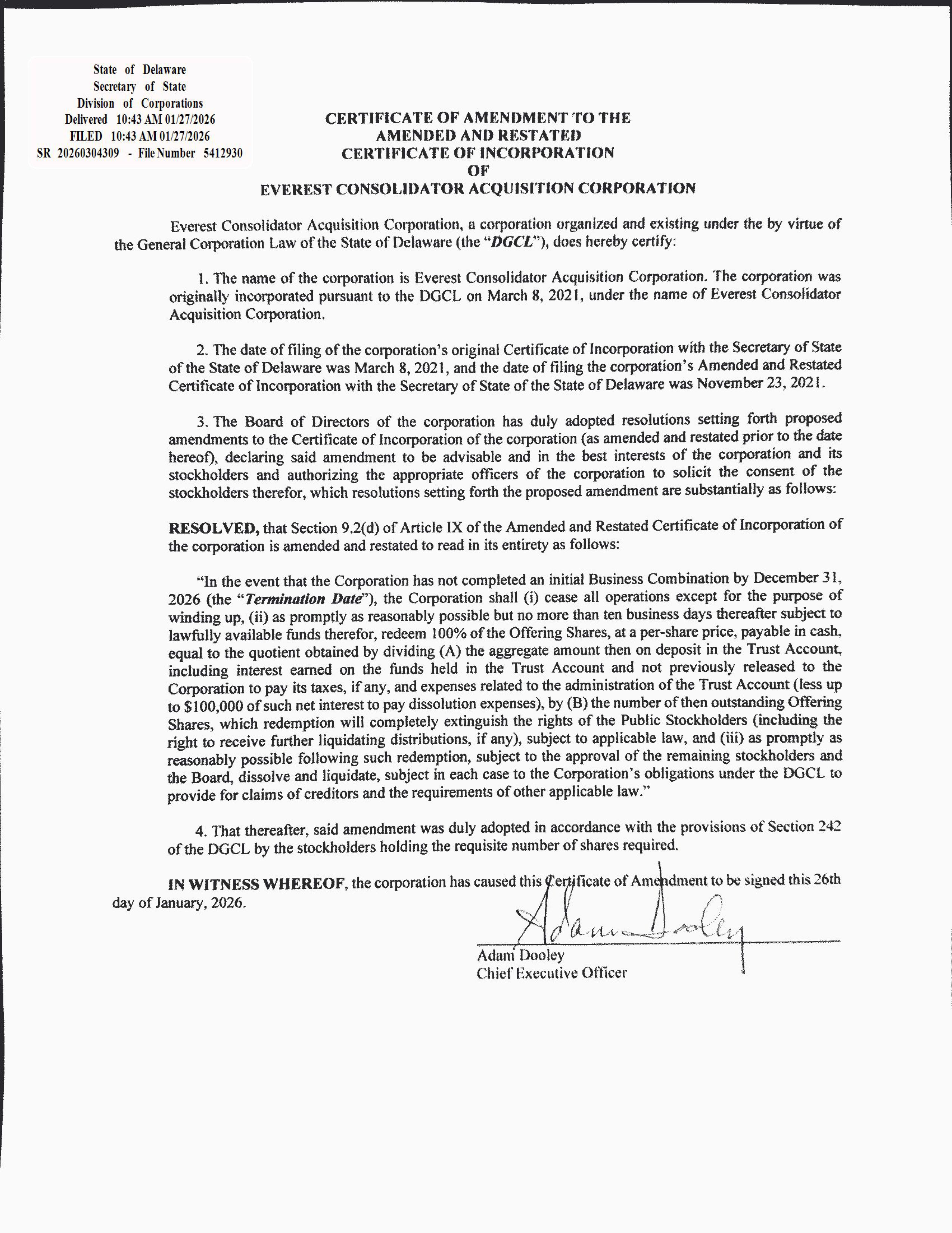 CERTIFICATE OF AMENDMENT TO THE AMENDED AND RESTATim CERTIFICATE OF INCORPORATION OF EVEREST CONSOLIDATOR ACQUISITION CORPORATION Everest Consolidator Acquisition Corporation, a corporation organized and existing under the by virtue of the General Corporation Law of the State of Delaware (the "DGCL" ), does hereby certify: L The name of the corporation is Everest Consolidator Acquisition Corporation. The corporation was originally incorporated pursuant to the DGCL on March 8, 2021, under the name of Everest Consolidator Acquisition Corporation. 2. The date of filing of the corporation's original Certificate of Incorporation with the Secretary of State of the State of Delaware was March 8, 2021, and the date of filing the corporation's Amended and Restated Certificate of Incorporation with the Secretary of State of the State of Delaware was November 23, 202 I . 3.The Board of Directors of the corporation has duly adopted resolutions setting forth proposed amendments to the Certificate of Incorporation of the corporation (as amended and restated prior to the date hereof), declaring said amendment to be advisable and in the best interests of the corporation and its stockholders and authorizing the appropriate officers of the corporation to solicit the consent of the stockholders therefor, which resolutions setting forth the proposed amendment are substantially as follows: RESOLVED, that Section 9.2(d) of Article IX of the Amended and Restated Certificate of Incorporation of the corporation is amended and restated to read in its entirety as follows: ..In the event that the Corporation has not completed an initial Business Combination by December 31, 2026 (the "Termination Date" ), the Corporation shall (i) cease all operations except for the purpose of winding up, (ii) as promptly as reasonably possible but no more than ten business days thereafter subject to lawfully available funds therefor, redeem 100% of the Offering Shares, at a per-share price, payable in cash, equal to the quotient obtained by dividing (A) the aggregate amount then on deposit in the Trust Account, including interest earned on the funds held in the Trust Account and not previously released to the Corporation to pay its taxes, if any, and expenses related to the administration ofthe Trust Account (less up to $100,000 of such net interest to pay dissolution expenses), by (B) the number of then outstanding Offering Shares, which redemption will completely extinguish the rights of the Public Stockholders (including the right to receive further liquidating distributions, if any), subject to applicable law, and (iii) as promptly as reasonably possible following such redemption, subject to the approval of the remaining stockholders and the Board, dissolve and liquidate, subject in each case to the Corporation's obligations under the DGCL to provide for claims of creditors and the requirements of other applicable law." 4.That thereafter, said amendment was duly adopted in accordance with the provisions of Section 242 ofthe DGCL by the stockholders holding the requisite number of shares required. IN WITNESS WHEREOF, the corporation has caused this •r,focate of Amfdment .·.to be signed this 26th day of January, 2026. rJ 0-A.A- Adam Dooley Chief Executive Otlicer