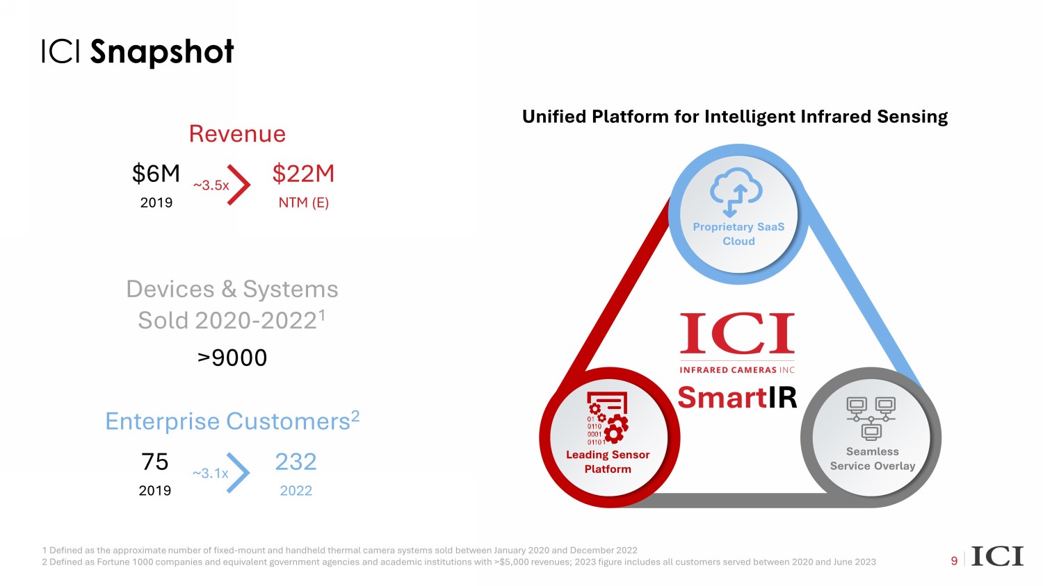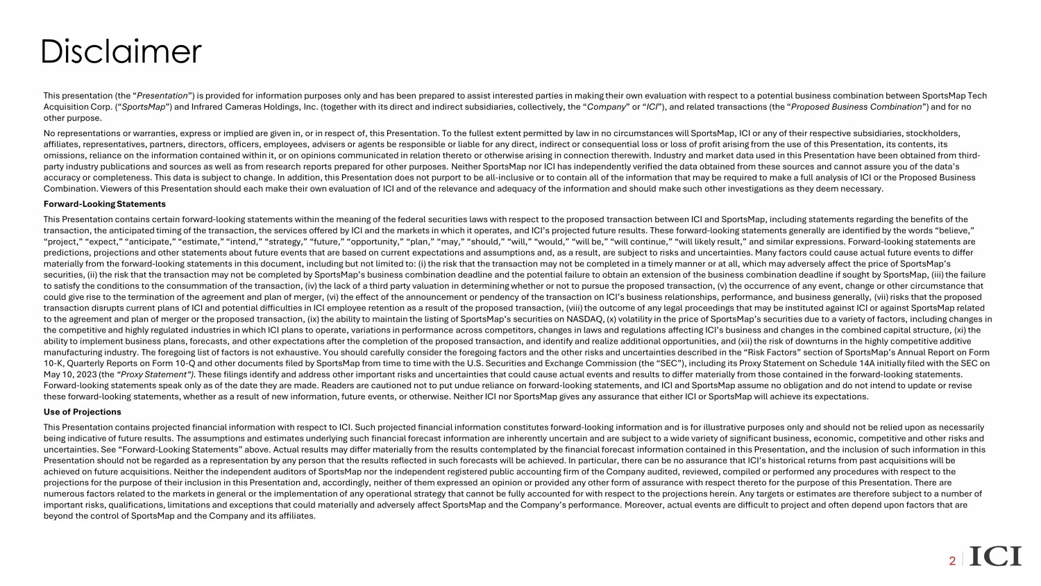 This presentation (the “ Presentation ”) is provided for information purposes only and has been prepared to assist interested parties in making their own evaluatio n w ith respect to a potential business combination between SportsMap Tech Acquisition Corp. (“ SportsMap ”) and Infrared Cameras Holdings, Inc. (together with its direct and indirect subsidiaries, collectively, the “ Company ” or “ ICI ”), and related transactions (the “ Proposed Business Combination ”) and for no other purpose. No representations or warranties, express or implied are given in, or in respect of, this Presentation. To the fullest extent pe rmitted by law in no circumstances will SportsMap, ICI or any of their respective subsidiaries, stockholders, affiliates, representatives, partners, directors, officers, employees, advisers or agents be responsible or liable for any di rec t, indirect or consequential loss or loss of profit arising from the use of this Presentation, its contents, its omissions, reliance on the information contained within it, or on opinions communicated in relation thereto or otherwise aris ing in connection therewith. Industry and market data used in this Presentation have been obtained from third - party industry publications and sources as well as from research reports prepared for other purposes. Neither SportsMap nor I CI has independently verified the data obtained from these sources and cannot assure you of the data’s accuracy or completeness. This data is subject to change. In addition, this Presentation does not purport to be all - inclusive or to contain all of the information that may be required to make a full analysis of ICI or the Proposed Business Combination. Viewers of this Presentation should each make their own evaluation of ICI and of the relevance and adequacy of t he information and should make such other investigations as they deem necessary. Forward - Looking Statements This Presentation contains certain forward - looking statements within the meaning of the federal securities laws with respect to the proposed transaction between ICI and SportsMap, including statements regarding the benefits of the transaction, the anticipated timing of the transaction, the services offered by ICI and the markets in which it operates, and IC I’s projected future results. These forward - looking statements generally are identified by the words “believe,” “project,” “expect,” “anticipate,” “estimate,” “intend,” “strategy,” “future,” “opportunity,” “plan,” “may,” “should,” “will, ” “ would,” “will be,” “will continue,” “will likely result,” and similar expressions. Forward - looking statements are predictions, projections and other statements about future events that are based on current expectations and assumptions and, as a result, are subject to risks and uncertainties. Many factors could cause actual future events to differ materially from the forward - looking statements in this document, including but not limited to: ( i ) the risk that the transaction may not be completed in a timely manner or at all, which may adversely affect the price of Sp ort sMap’s securities, (ii) the risk that the transaction may not be completed by SportsMap’s business combination deadline and the pote nti al failure to obtain an extension of the business combination deadline if sought by SportsMap, (iii) the failure to satisfy the conditions to the consummation of the transaction, (iv) the lack of a third party valuation in determining whe the r or not to pursue the proposed transaction, (v) the occurrence of any event, change or other circumstance that could give rise to the termination of the agreement and plan of merger, (vi) the effect of the announcement or pendency of th e t ransaction on ICI’s business relationships, performance, and business generally, (vii) risks that the proposed transaction disrupts current plans of ICI and potential difficulties in ICI employee retention as a result of the proposed tr ans action, (viii) the outcome of any legal proceedings that may be instituted against ICI or against SportsMap related to the agreement and plan of merger or the proposed transaction, (ix) the ability to maintain the listing of SportsMap’s secu rit ies on NASDAQ, (x) volatility in the price of SportsMap’s securities due to a variety of factors, including changes in the competitive and highly regulated industries in which ICI plans to operate, variations in performance across competitors, cha nges in laws and regulations affecting ICI’s business and changes in the combined capital structure, (xi) the ability to implement business plans, forecasts, and other expectations after the completion of the proposed transaction, and ide ntify and realize additional opportunities, and (xii) the risk of downturns in the highly competitive additive manufacturing industry. The foregoing list of factors is not exhaustive. You should carefully consider the foregoing factors and the other risks and uncertainties described in the “Risk Factors” section of SportsMap’s Annual Report on Form 10 - K, Quarterly Reports on Form 10 - Q and other documents filed by SportsMap from time to time with the U.S. Securities and Excha nge Commission (the “SEC”), including its Proxy Statement on Schedule 14A initially filed with the SEC on May 10, 2023 (the “Proxy Statement”). These filings identify and address other important risks and uncertainties that could cause actual events and results to diff er materially from those contained in the forward - looking statements. Forward - looking statements speak only as of the date they are made. Readers are cautioned not to put undue reliance on forward - l ooking statements, and ICI and SportsMap assume no obligation and do not intend to update or revise these forward - looking statements, whether as a result of new information, future events, or otherwise. Neither ICI