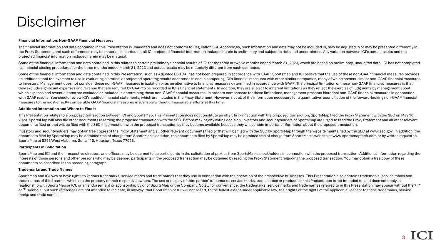 Financial Information; Non - GAAP Financial Measures The financial information and data contained in this Presentation is unaudited and does not conform to Regulation S - X. According ly, such information and data may not be included in, may be adjusted in or may be presented differently in, the Proxy Statement, and such differences may be material. In particular, all ICI projected financial information included he rei n is preliminary and subject to risks and uncertainties. Any variation between ICI’s actual results and the projected financial information included herein may be material. Some of the financial information and data contained in this relates to certain preliminary financial results of ICI for the thr ee or twelve months ended March 31, 2023, which are based on preliminary, unaudited date. ICI has not completed its financial closing procedures for the three months ended March 31, 2023 and actual results may be materially different fro m s uch estimates. Some of the financial information and data contained in this Presentation, such as Adjusted EBITDA, has not been prepared in acc ordance with GAAP. SportsMap and ICI believe that the use of these non - GAAP financial measures provides an additional tool for investors to use in evaluating historical or projected operating results and trends in and in comparin g I CI's financial measures with other similar companies, many of which present similar non - GAAP financial measures to investors. Management does not consider these non - GAAP measures in isolation or as an alternative to financial measures deter mined in accordance with GAAP. The principal limitation of these non - GAAP financial measures is that they exclude significant expenses and revenue that are required by GAAP to be recorded in ICI's financial statements. In addi tio n, they are subject to inherent limitations as they reflect the exercise of judgments by management about which expense and revenue items are excluded or included in determining these non - GAAP financial measures. In order to compensat e for these limitations, management presents historical non - GAAP financial measures in connection with GAAP results. You should review ICI's audited financial statements, which are included in the Proxy Statement. However, not all of the information necessary for a quantitative reconciliation of the forward - looking non - GAAP financial measures to the most directly comparable GAAP financial measures is available without unreasonable efforts at this time. Additional Information and Where to Find It This Presentation relates to a proposed transaction between ICI and SportsMap . This Presentation does not constitute an offer. In connection with the proposed transaction, SportsMap filed the Proxy Statement with the SEC on May 10, 2023. SportsMap will also file other documents regarding the proposed transaction with the SEC. Before making any voting decision, investors an d securityholders of SportsMap are urged to read the Proxy Statement and all other relevant documents filed or that will be filed with the SEC in connection with the proposed transaction as they become available becau se they will contain important information about the proposed transaction. Investors and securityholders may obtain free copies of the Proxy Statement and all other relevant documents filed or that wi ll be filed with the SEC by SportsMap through the website maintained by the SEC at www.sec.gov. In addition, the documents filed by SportsMap may be obtained free of charge from SportsMap's addition, the documents filed by SportsMap may be obtained free of charge from SportsMap's website at www.sportsmaptech.com or by written request to SportsMap at 5353 West Alabama, Suite 415, Houston, Texas 77056. Participants in Solicitation SportsMap and ICI and their respective directors and officers may be deemed to be participants in the solicitation of proxies from Spor ts Map’s stockholders in connection with the proposed transaction. Additional information regarding the interests of those persons and other persons who may be deemed participants in the proposed transaction may be obtained by re adi ng the Proxy Statement regarding the proposed transaction. You may obtain a free copy of these documents as described in the preceding paragraph. Trademarks and Trade Names SportsMap and ICI own or have rights to various trademarks, service marks and trade names that they use in connection with th e o peration of their respective businesses. This Presentation also contains trademarks, service marks and trade names of third parties, which are the property of their respective owners. The use or display of third parties’ tradema rks , service marks, trade names or products in this Presentation is not intended to, and does not imply, a relationship with SportsMap or ICI, or an endorsement or sponsorship by or of SportsMap or the Company. Solely for convenienc e, the trademarks, service marks and trade names referred to in this Presentation may appear without the ®, ¯ or SM symbols, but such references are not intended to indicate, in anyway, that SportsMap or ICI will not assert, to the fullest e xt ent under applicable law, their rights or the rights of the applicable licensor to these trademarks, service marks and trade names. Disclaimer 3