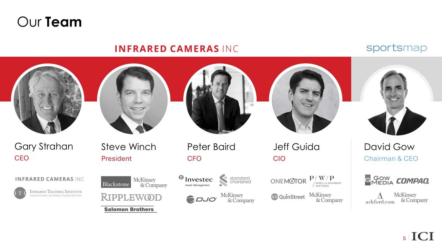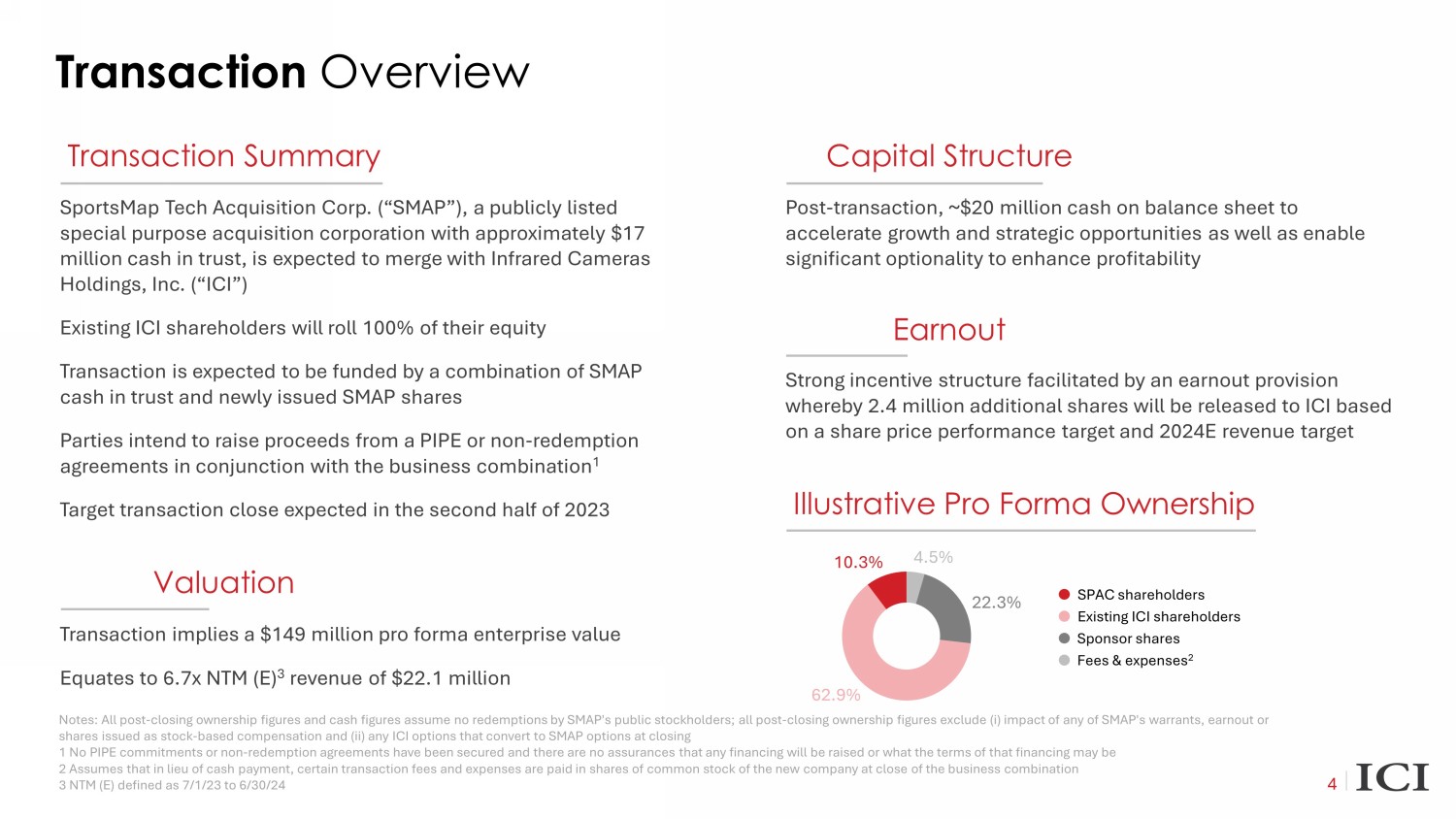 Earnout Strong incentive structure facilitated by an earnout provision whereby 2.4 million additional shares will be released to ICI based on a share price performance target and 2024E revenue target Valuation Transaction implies a $149 million pro forma enterprise value Equates to 6.7x NTM (E) 3 revenue of $22.1 million Transaction Overview 4 Transaction Summary Capital Structure SportsMap Tech Acquisition Corp. (“SMAP”), a publicly listed special purpose acquisition corporation with approximately $17 million cash in trust, is expected to merge with Infrared Cameras Holdings, Inc. (“ICI”) Existing ICI shareholders will roll 100% of their equity Transaction is expected to be funded by a combination of SMAP cash in trust and newly issued SMAP shares Parties intend to raise proceeds from a PIPE or non - redemption agreements in conjunction with the business combination 1 Target transaction close expected in the second half of 2023 Post - transaction, ~$20 million cash on balance sheet to accelerate growth and strategic opportunities as well as enable significant optionality to enhance profitability Illustrative Pro Forma Ownership Notes: All post - closing ownership figures and cash figures assume no redemptions by SMAP's public stockholders; all post - closing ownership figures exclude ( i ) impact of any of SMAP's warrants, earnout or shares issued as stock - based compensation and (ii) any ICI options that convert to SMAP options at closing 1 No PIPE commitments or non - redemption agreements have been secured and there are no assurances that any financing will be rais ed or what the terms of that financing may be 2 Assumes that in lieu of cash payment, certain transaction fees and expenses are paid in shares of common stock of the new c omp any at close of the business combination 3 NTM (E) defined as 7/1/23 to 6/30/24 4.5% 22.3% 62.9% 10.3% Existing ICI shareholders SPAC shareholders Sponsor shares Fees & expenses 2
