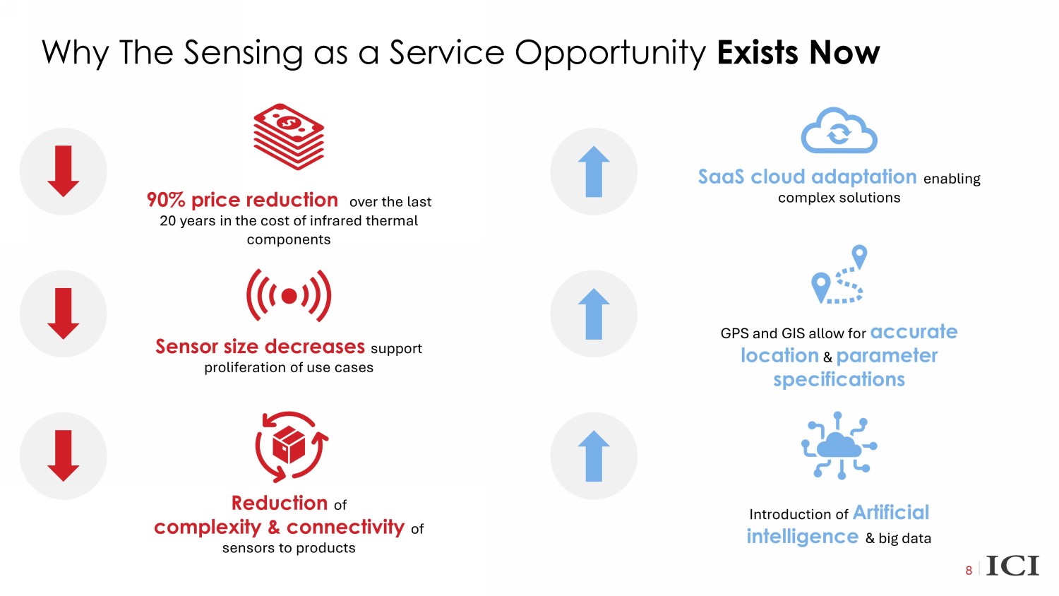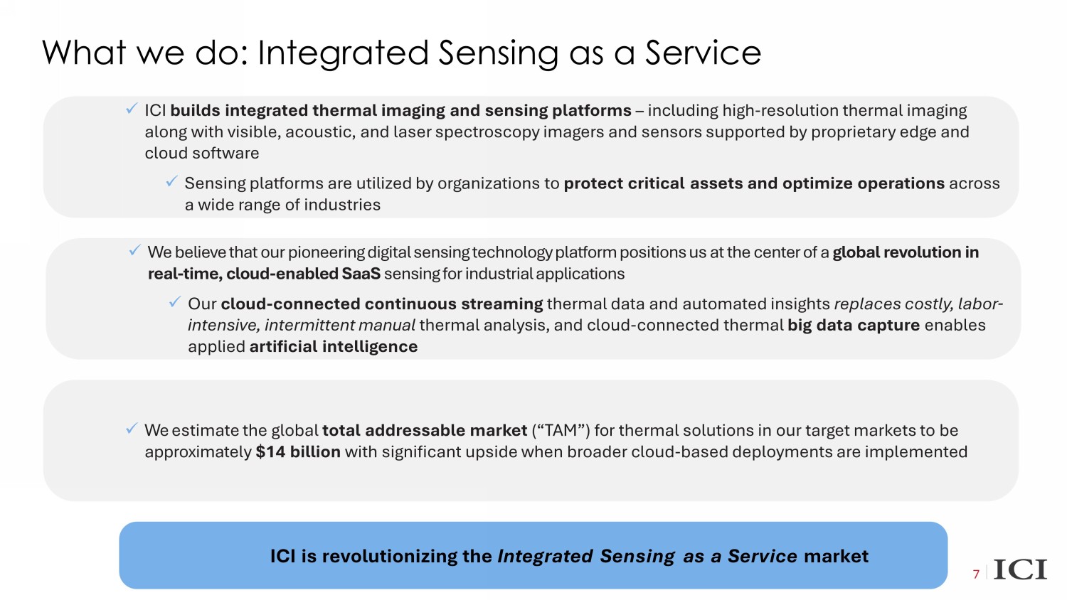 What we do: Integrated Sensing as a Service 7 x ICI builds integrated thermal imaging and sensing platforms – including high - resolution thermal imaging along with visible, acoustic, and laser spectroscopy imagers and sensors supported by proprietary edge and cloud software x Sensing platforms are utilized by organizations to protect critical assets and optimize operations across a wide range of industries x We believe that our pioneering digital sensing technology platform positions us at the center of a global revolution in real - time, cloud - enabled SaaS sensing for industrial applications x Our cloud - connected continuous streaming thermal data and automated insights replaces costly, labor - intensive, intermittent manual thermal analysis, and cloud - connected thermal big data capture enables applied artificial intelligence x We estimate the global total addressable market (“TAM”) for thermal solutions in our target markets to be approximately $14 billion with significant upside when broader cloud - based deployments are implemented ICI is revolutionizing the Integrated Sensing as a Service market