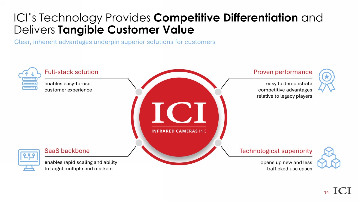 13 Redefining the Market Opportunity ICI is positioned to define and tap into multiple large and growing markets Distribution & Logistics x Conveyor system anomaly detection x Hot spot detection x Process automation x Predictive maintenance x Failure avoidance Oil & Gas Manufacturing Utilities x Gas/liquid leak detection x Tank - level and flare monitoring x Pipeline leak detection x Gas processing safety monitoring x Power panel monitoring x Production motor drives and vehicles x Early fire detection x Electrified transport battery monitoring x Arrestor, columns and termination monitoring x Transformer leak detection x Fault detection x Solar field and wind turbine inspection Conveyor System Monitoring Gas Leak Detection Utility T&D Monitoring Yield Improvement & Waste Reduction