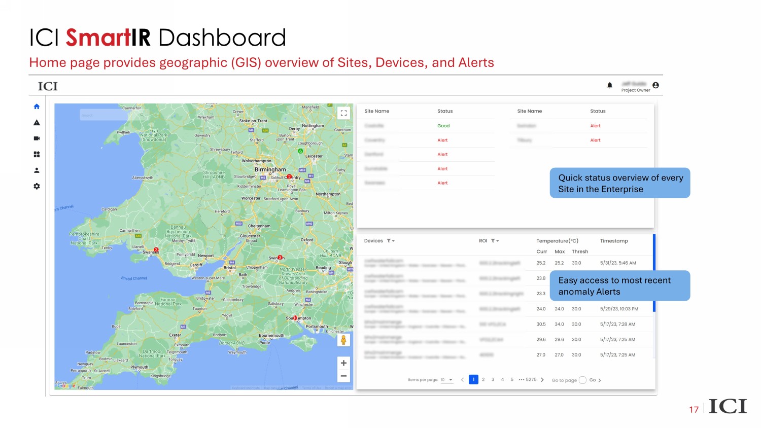 17 ICI Smart IR Dashboard Home page provides geographic (GIS) overview of Sites, Devices, and Al erts Quick status overview of every Site in the Enterprise Easy access to most recent anomaly Alerts