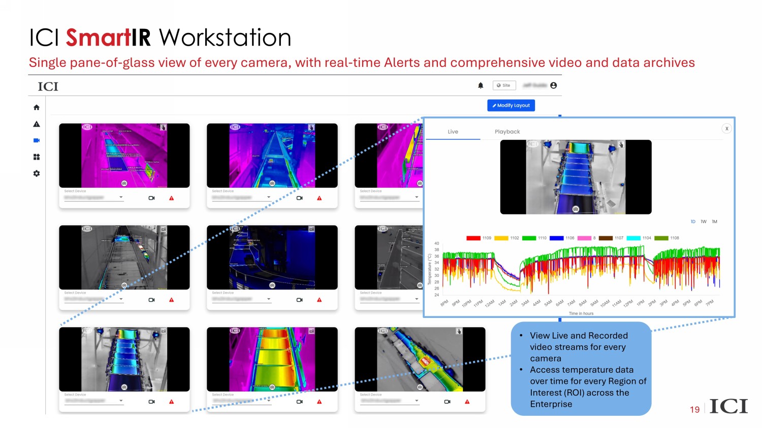 19 ICI Smart IR Workstation Single pane - of - glass view of every camera, with real - time Alerts and comprehensive video and data archives • View Live and Recorded video streams for every camera • Access temperature data over time for every Region of Interest (ROI) across the Enterprise