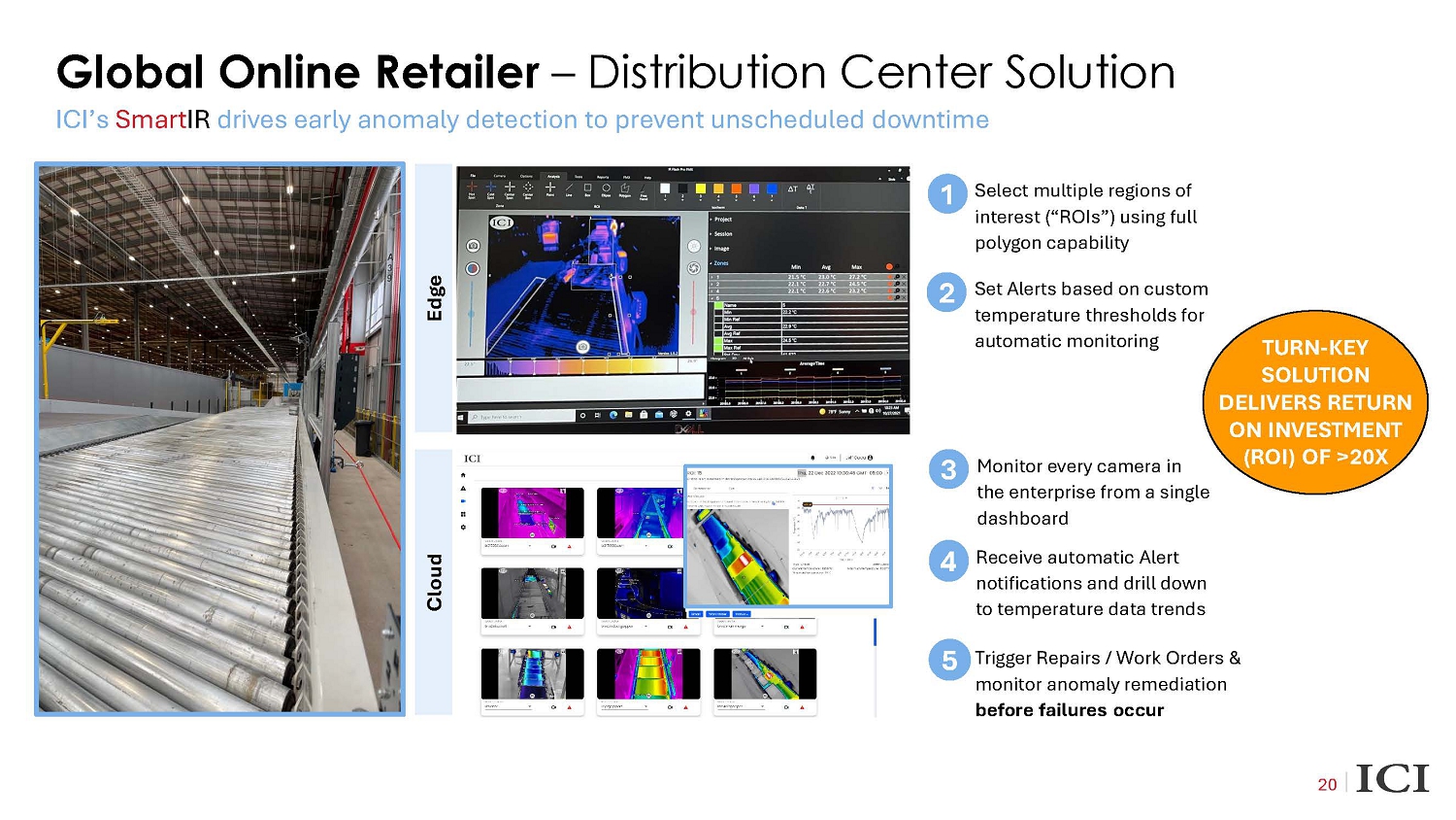 ICI’s Smart IR drives early anomaly detection to prevent unscheduled downtime Set Alerts based on custom temperature thresholds for automatic monitoring Select multiple regions of interest (“ROIs”) using full polygon capability 1 2 Edge Cloud Receive automatic Alert notifications and drill down to temperature data trends Monitor every camera in the enterprise from a single dashboard Trigger Repairs / Work Orders & monitor anomaly remediation before failures occur 3 4 5 TURN - KEY SOLUTION DELIVERS RETURN ON INVESTMENT (ROI) OF >20X Global On - Line Retailer – Distribution Center Solution 20