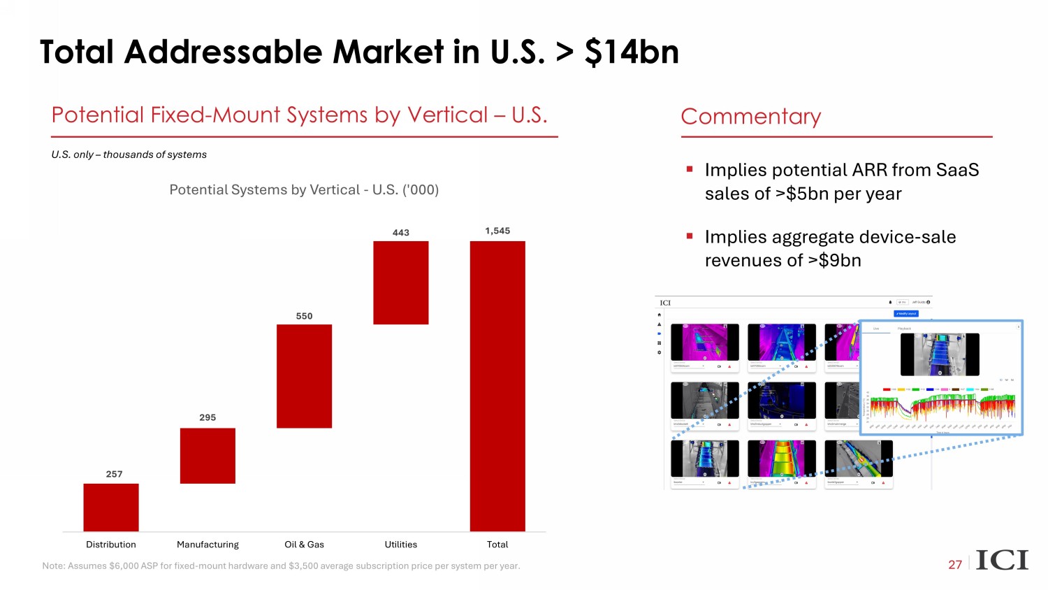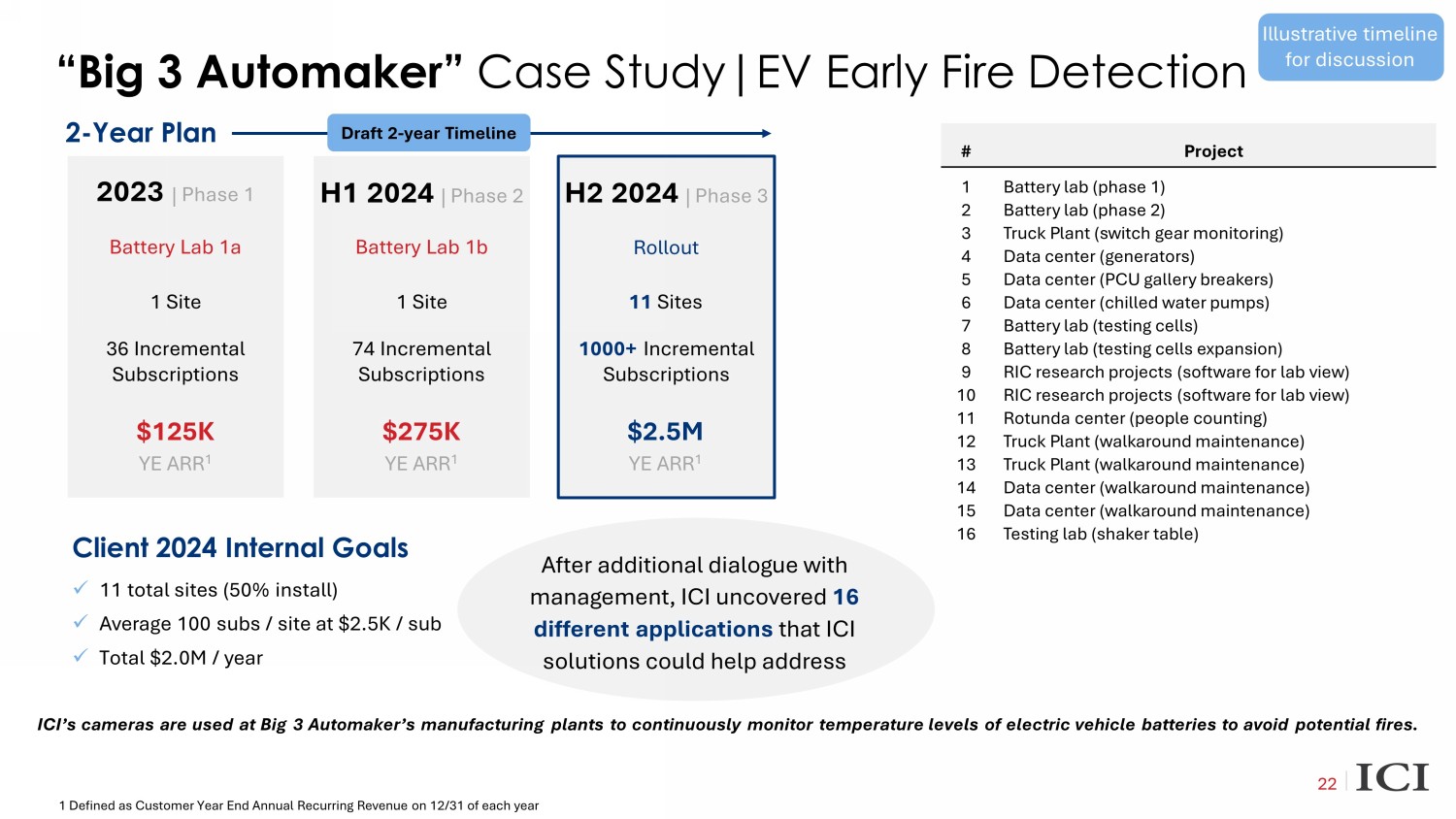 “Big 3 Automaker” Case Study|EV Early Fire Detection 22 H1 2024 | Phase 2 H2 2024 | Phase 3 2023 | Phase 1 2 - Year Plan $125K YE ARR 1 $275K YE ARR 1 $2.5M YE ARR 1 Battery Lab 1a Battery Lab 1b Rollout 1 Site 1 Site 11 Sites 36 Incremental Subscriptions 74 Incremental Subscriptions 1000+ Incremental Subscriptions Client 2024 Internal Goals x 11 total sites (50% install) x Average 100 subs / site at $2.5K / sub x Total $2.0M / year After additional dialogue with management, ICI uncovered 16 different applications that ICI solutions could help address # Project 1 Battery lab (phase 1) 2 Battery lab (phase 2) 3 Truck Plant (switch gear monitoring) 4 Data center (generators) 5 Data center (PCU gallery breakers) 6 Data center (chilled water pumps) 7 Battery lab (testing cells) 8 Battery lab (testing cells expansion) 9 RIC research projects (software for lab view) 10 RIC research projects (software for lab view) 11 Rotunda center (people counting) 12 Truck Plant (walkaround maintenance) 13 Truck Plant (walkaround maintenance) 14 Data center (walkaround maintenance) 15 Data center (walkaround maintenance) 16 Testing lab (shaker table) ICI’s cameras are used at Big 3 Automaker’s manufacturing plants to continuously monitor temperature levels of electric vehic le batteries to avoid potential fires. 1 Defined as Customer Year End Annual Recurring Revenue on 12/31 of each year Draft 2 - year Timeline Illustrative timeline for discussion