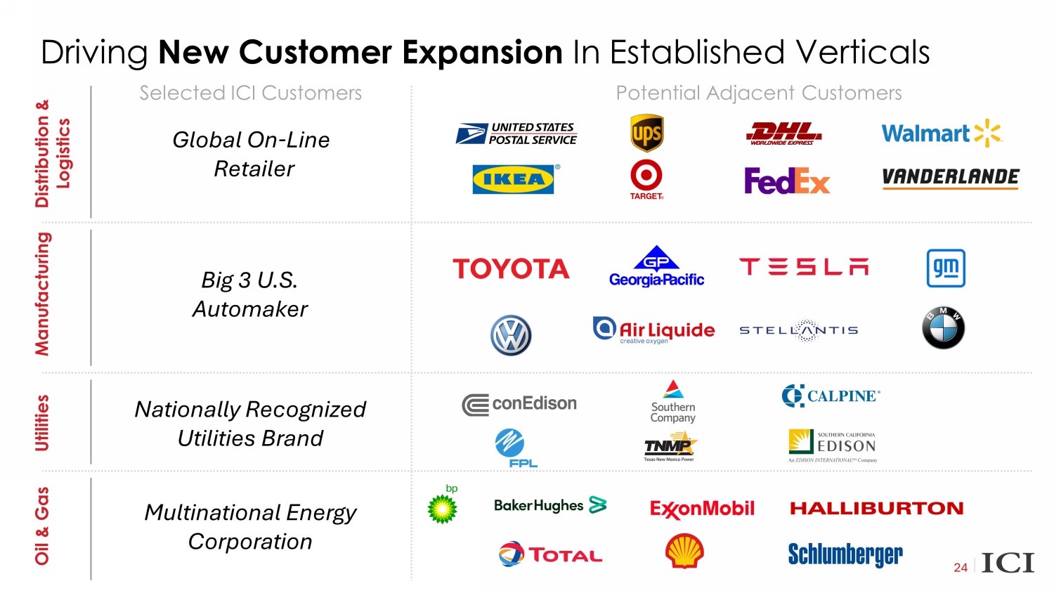 Driving New Customer Expansion In Established Verticals 24 Selected ICI Customers Potential Adjacent Customers Distribution & Logistics Manufacturing Utilities Oil & Gas Global On - Line Retailer Big 3 U.S. Automaker Nationally Recognized Utilities Brand Multinational Energy Corporation