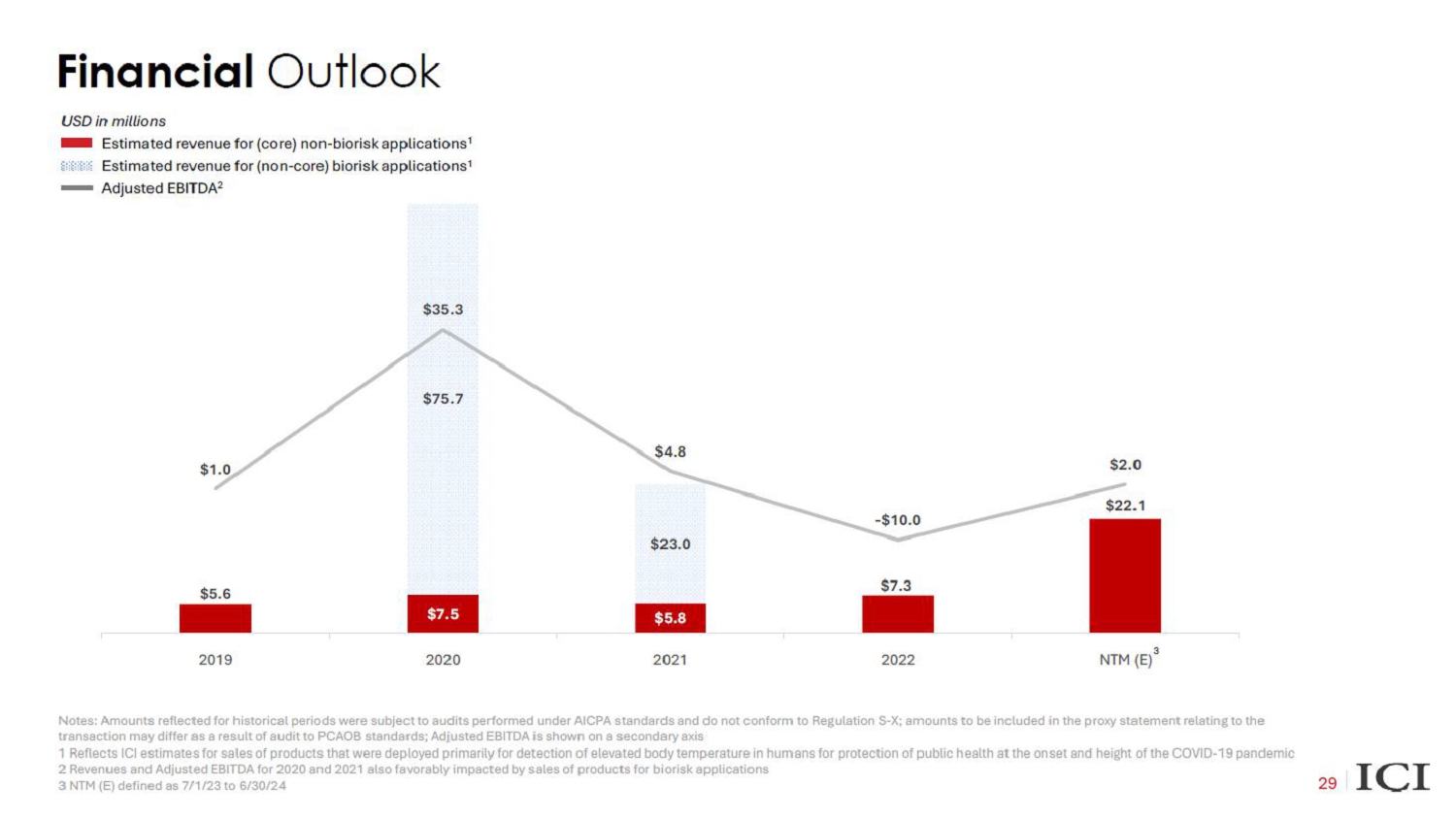 Financial Outlook 29 Gross Margin 47% 53% 64% 62% 4 66% Notes: Amounts reflected for historical periods were subject to audits performed under AICPA standards and do not conform to Reg ulation S - X; amounts to be included in the proxy statement relating to the transaction may differ as a result of audit to PCAOB standards; Adjusted EBITDA is shown on a secondary axis 1 Reflects ICI estimates for sales of products that were deployed primarily for detection of elevated body temperature in hum ans for protection of public health at the onset and height of the COVID - 19 pandemic 2 Adjusted EBITDA for 2020 and 2021 also favorably impacted by sales of products for biorisk applications 3 See page 23 for a summary of key assumptions underlying ICI’s 2023E forecasts 4 2022 and 2023E Gross Margin figures adjusted for inventory changes 5 NTM (E) defined as 7/1/23 to 6/30/24 3 Estimated revenue for non - biorisk applications 1 Estimated revenue for biorisk applications 1 USD in millions Adjusted EBITDA 2 $5.6 $7.5 $5.8 $7.3 $22.1 $75.7 $23.0 $1.0 $35.3 $4.8 - $7.1 $2.0 -30 -20 -10 0 10 20 30 40 50 60 70 0 10 20 30 40 50 60 70 80 90 Manufacturing 2020 2021 2022 NTM (E)