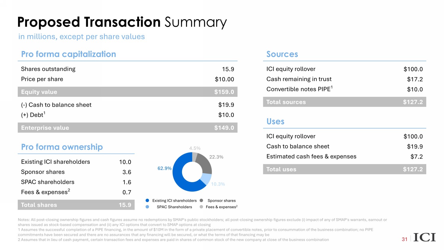 Pro forma capitalization Shares outstanding 15.9 Price per share $10.00 Equity value $159.0 ( - ) Cash to balance sheet $19.9 (+) Debt 1 $10.0 Enterprise value $149.0 Pro forma ownership Existing ICI shareholders 10.0 Sponsor shares 3.6 SPAC shareholders 1.6 Fees & expenses 2 0.7 Total shares 15.9 Proposed Transaction Summary 31 Sources ICI equity rollover $100.0 Cash remaining in trust $17.2 Convertible notes PIPE 1 $10.0 Total sources $127.2 in millions, except per share values Uses ICI equity rollover $100.0 Cash to balance sheet $19.9 Estimated cash fees & expenses $7.2 Total uses $127.2 4.5% 22.3% 10.3% 62.9% SPAC Shareholders Existing ICI shareholders Sponsor shares Fees & expenses 2 Notes: All post - closing ownership figures and cash figures assume no redemptions by SMAP's public stockholders; all post - closing ownership figures exclude ( i ) impact of any of SMAP's warrants, earnout or shares issued as stock - based compensation and (ii) any ICI options that convert to SMAP options at closing 1 Assumes the successful completion of a PIPE financing, in the amount of $10M in the form of a private placement of converti ble notes, prior to consummation of the business combination; no PIPE commitments have been secured and there are no assurances that any financing will be secured, or what the terms of that finan cin g may be 2 Assumes that in lieu of cash payment, certain transaction fees and expenses are paid in shares of common stock of the new c omp any at close of the business combination