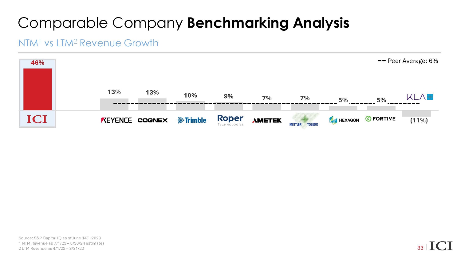 2022E Comparable Company Benchmarking Analysis 32 Source: S&P Capital IQ as of May 30 th , 2023 1 NTM defined as 7/1/23 – 6/30/24 estimates 2 NTM defined as 7/1/22 – 6/30/24 for ICI; comparable company GM% are LTM to 3/31/23 Enterprise Value / NTM 1 Revenue Gross Margin 2 Peer Average: 6.9x Peer Average: 62% na 6.7x 13.4x 8.1x 8.1x 7.9x 6.4x 6.1x 5.0x 4.1x 3.5x 69% 82% 72% 70% 66% 60% 61% 59% 58% 35%