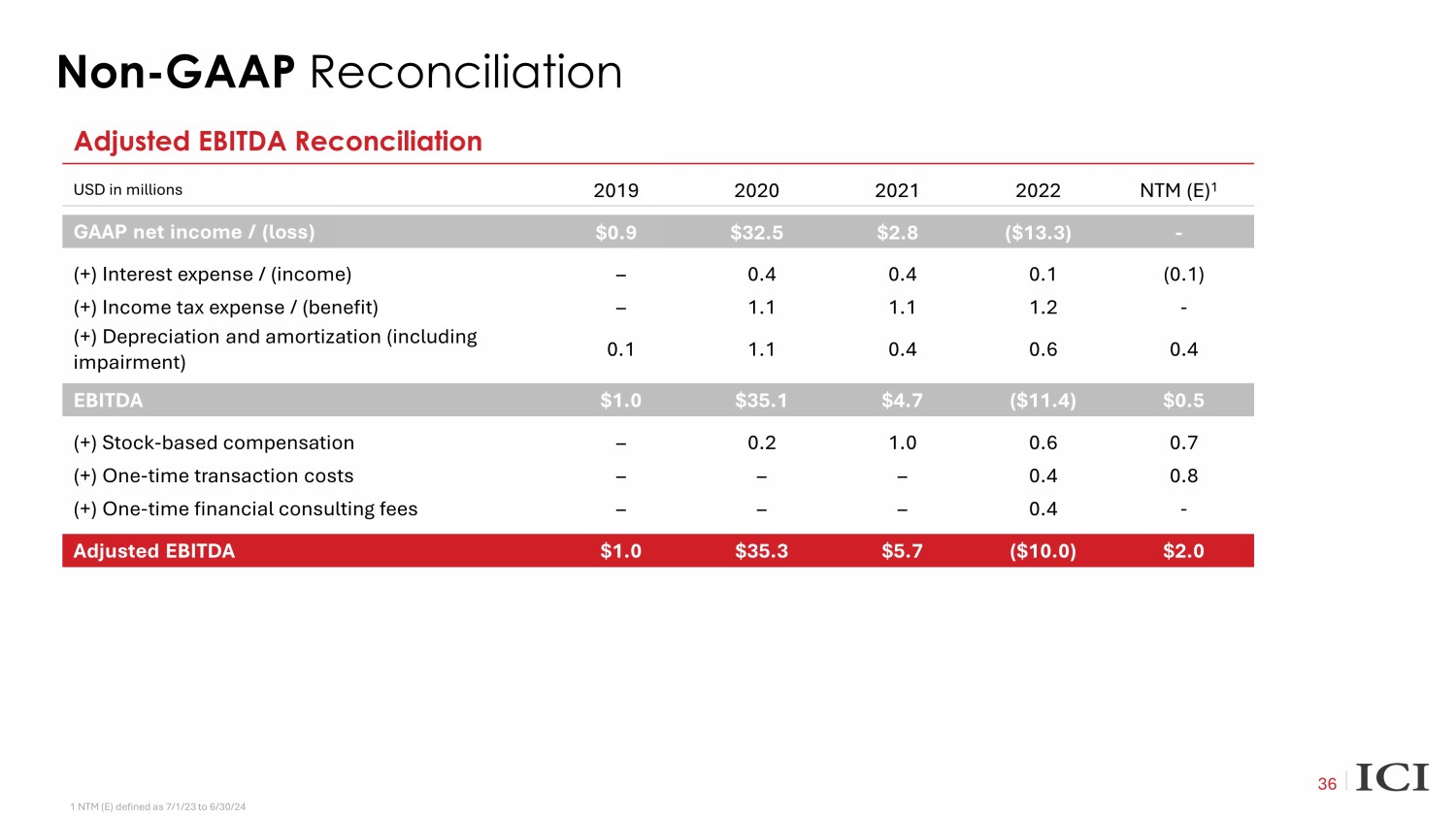 Non - GAAP Reconciliation 36 Adjusted EBITDA Reconciliation USD in millions 2019 2020 2021 2022 NTM (E) 1 GAAP net income / (loss) $0.9 $32.5 $2.8 ($13.3) - (+) Interest expense / (income) – 0.4 0.4 0.1 (0.1) (+) Income tax expense / (benefit) – 1.1 1.1 1.2 - (+) Depreciation and amortization (including impairment) 0.1 1.1 0.4 0.6 0.4 EBITDA $1.0 $35.1 $4.7 ($11.4) $0.5 (+) Stock - based compensation – 0.2 1.0 0.6 0.7 (+) One - time transaction costs – – – 0.4 0.8 (+) One - time financial consulting fees – – – 0.4 - Adjusted EBITDA $1.0 $35.3 $5.7 ($10.0) $2.0 1 NTM (E) defined as 7/1/23 to 6/30/24