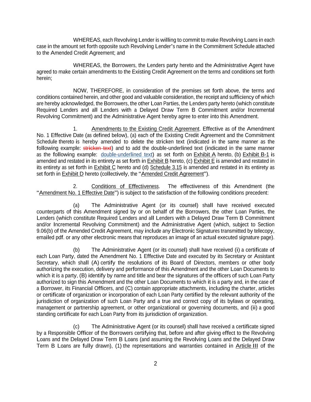 2 WHEREAS, each Revolving Lender is willing to commit to make Revolving Loans in each case in the amount set forth opposite such Revolving Lender’s name in the Commitment Schedule attached to the Amended Credit Agreement; and WHEREAS, the Borrowers, the Lenders party hereto and the Administrative Agent have agreed to make certain amendments to the Existing Credit Agreement on the terms and conditions set forth herein; NOW, THEREFORE, in consideration of the premises set forth above, the terms and conditions contained herein, and other good and valuable consideration, the receipt and sufficiency of which are hereby acknowledged, the Borrowers, the other Loan Parties, the Lenders party hereto (which constitute Required Lenders and all Lenders with a Delayed Draw Term B Commitment and/or Incremental Revolving Commitment) and the Administrative Agent hereby agree to enter into this Amendment. 1. Amendments to the Existing Credit Agreement. Effective as of the Amendment No. 1 Effective Date (as defined below), (a) each of the Existing Credit Agreement and the Commitment Schedule thereto is hereby amended to delete the stricken text (indicated in the same manner as the following example: stricken text) and to add the double-underlined text (indicated in the same manner as the following example: double-underlined text) as set forth on Exhibit A hereto, (b) Exhibit B-1 is amended and restated in its entirety as set forth in Exhibit B hereto, (c) Exhibit E is amended and restated in its entirety as set forth in Exhibit C hereto and (d) Schedule 3.15 is amended and restated in its entirety as set forth in Exhibit D hereto (collectively, the “Amended Credit Agreement”). 2. Conditions of Effectiveness. The effectiveness of this Amendment (the “Amendment No. 1 Effective Date”) is subject to the satisfaction of the following conditions precedent: (a) The Administrative Agent (or its counsel) shall have received executed counterparts of this Amendment signed by or on behalf of the Borrowers, the other Loan Parties, the Lenders (which constitute Required Lenders and all Lenders with a Delayed Draw Term B Commitment and/or Incremental Revolving Commitment) and the Administrative Agent (which, subject to Section 9.06(b) of the Amended Credit Agreement, may include any Electronic Signatures transmitted by telecopy, emailed pdf. or any other electronic means that reproduces an image of an actual executed signature page). (b) The Administrative Agent (or its counsel) shall have received (i) a certificate of each Loan Party, dated the Amendment No. 1 Effective Date and executed by its Secretary or Assistant Secretary, which shall (A) certify the resolutions of its Board of Directors, members or other body authorizing the execution, delivery and performance of this Amendment and the other Loan Documents to which it is a party, (B) identify by name and title and bear the signatures of the officers of such Loan Party authorized to sign this Amendment and the other Loan Documents to which it is a party and, in the case of a Borrower, its Financial Officers, and (C) contain appropriate attachments, including the charter, articles or certificate of organization or incorporation of each Loan Party certified by the relevant authority of the jurisdiction of organization of such Loan Party and a true and correct copy of its bylaws or operating, management or partnership agreement, or other organizational or governing documents, and (ii) a good standing certificate for each Loan Party from its jurisdiction of organization. (c) The Administrative Agent (or its counsel) shall have received a certificate signed by a Responsible Officer of the Borrowers certifying that, before and after giving effect to the Revolving Loans and the Delayed Draw Term B Loans (and assuming the Revolving Loans and the Delayed Draw Term B Loans are fully drawn), (1) the representations and warranties contained in Article III of the