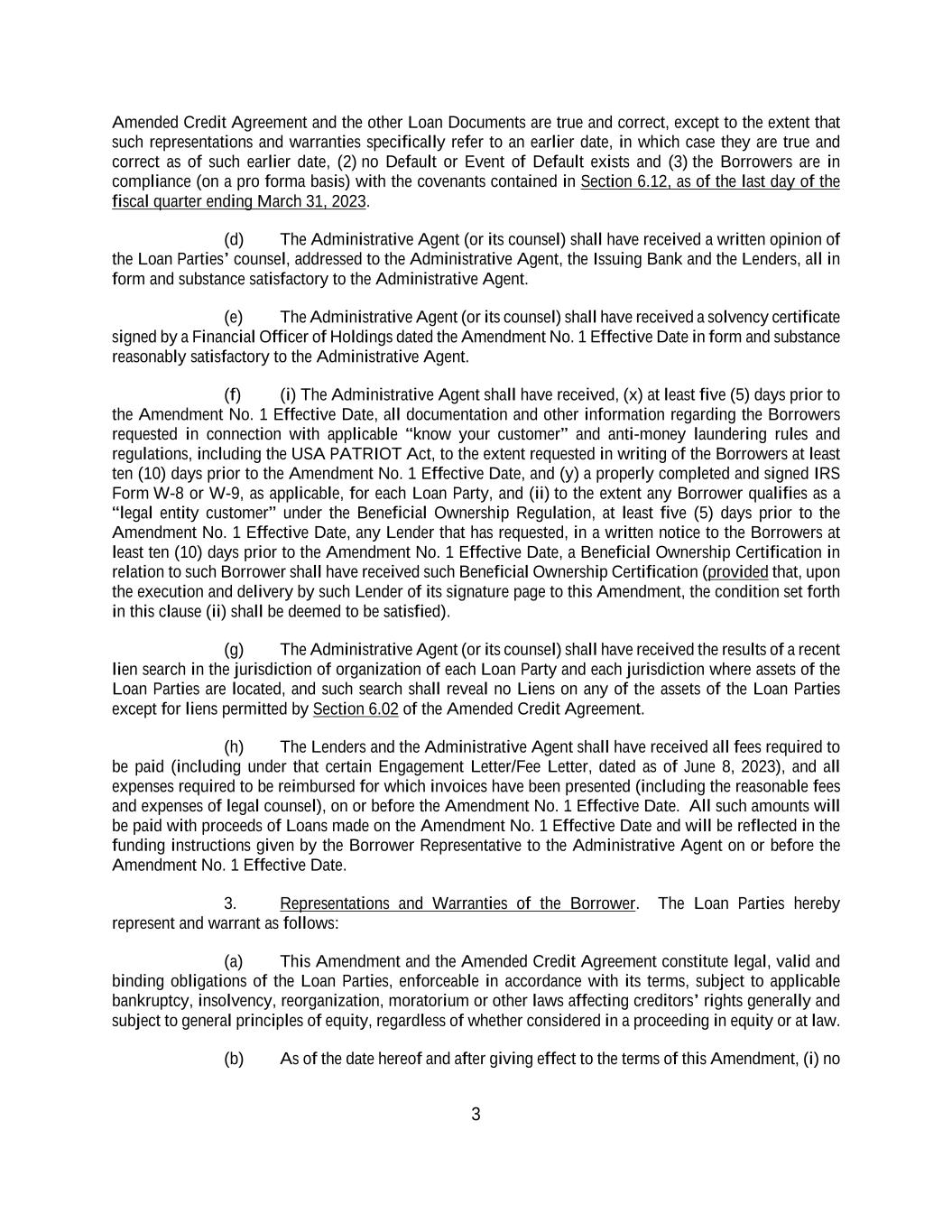 3 Amended Credit Agreement and the other Loan Documents are true and correct, except to the extent that such representations and warranties specifically refer to an earlier date, in which case they are true and correct as of such earlier date, (2) no Default or Event of Default exists and (3) the Borrowers are in compliance (on a pro forma basis) with the covenants contained in Section 6.12, as of the last day of the fiscal quarter ending March 31, 2023. (d) The Administrative Agent (or its counsel) shall have received a written opinion of the Loan Parties’ counsel, addressed to the Administrative Agent, the Issuing Bank and the Lenders, all in form and substance satisfactory to the Administrative Agent. (e) The Administrative Agent (or its counsel) shall have received a solvency certificate signed by a Financial Officer of Holdings dated the Amendment No. 1 Effective Date in form and substance reasonably satisfactory to the Administrative Agent. (f) (i) The Administrative Agent shall have received, (x) at least five (5) days prior to the Amendment No. 1 Effective Date, all documentation and other information regarding the Borrowers requested in connection with applicable “know your customer” and anti-money laundering rules and regulations, including the USA PATRIOT Act, to the extent requested in writing of the Borrowers at least ten (10) days prior to the Amendment No. 1 Effective Date, and (y) a properly completed and signed IRS Form W-8 or W-9, as applicable, for each Loan Party, and (ii) to the extent any Borrower qualifies as a “legal entity customer” under the Beneficial Ownership Regulation, at least five (5) days prior to the Amendment No. 1 Effective Date, any Lender that has requested, in a written notice to the Borrowers at least ten (10) days prior to the Amendment No. 1 Effective Date, a Beneficial Ownership Certification in relation to such Borrower shall have received such Beneficial Ownership Certification (provided that, upon the execution and delivery by such Lender of its signature page to this Amendment, the condition set forth in this clause (ii) shall be deemed to be satisfied). (g) The Administrative Agent (or its counsel) shall have received the results of a recent lien search in the jurisdiction of organization of each Loan Party and each jurisdiction where assets of the Loan Parties are located, and such search shall reveal no Liens on any of the assets of the Loan Parties except for liens permitted by Section 6.02 of the Amended Credit Agreement. (h) The Lenders and the Administrative Agent shall have received all fees required to be paid (including under that certain Engagement Letter/Fee Letter, dated as of June 8, 2023), and all expenses required to be reimbursed for which invoices have been presented (including the reasonable fees and expenses of legal counsel), on or before the Amendment No. 1 Effective Date. All such amounts will be paid with proceeds of Loans made on the Amendment No. 1 Effective Date and will be reflected in the funding instructions given by the Borrower Representative to the Administrative Agent on or before the Amendment No. 1 Effective Date. 3. Representations and Warranties of the Borrower. The Loan Parties hereby represent and warrant as follows: (a) This Amendment and the Amended Credit Agreement constitute legal, valid and binding obligations of the Loan Parties, enforceable in accordance with its terms, subject to applicable bankruptcy, insolvency, reorganization, moratorium or other laws affecting creditors’ rights generally and subject to general principles of equity, regardless of whether considered in a proceeding in equity or at law. (b) As of the date hereof and after giving effect to the terms of this Amendment, (i) no
