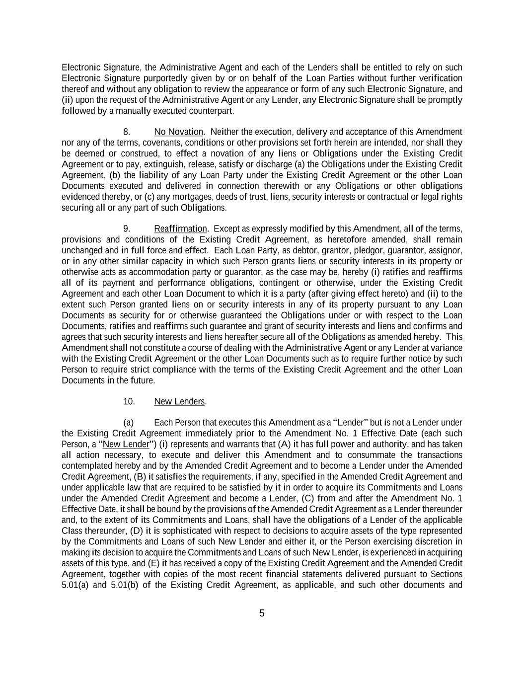 5 Electronic Signature, the Administrative Agent and each of the Lenders shall be entitled to rely on such Electronic Signature purportedly given by or on behalf of the Loan Parties without further verification thereof and without any obligation to review the appearance or form of any such Electronic Signature, and (ii) upon the request of the Administrative Agent or any Lender, any Electronic Signature shall be promptly followed by a manually executed counterpart. 8. No Novation. Neither the execution, delivery and acceptance of this Amendment nor any of the terms, covenants, conditions or other provisions set forth herein are intended, nor shall they be deemed or construed, to effect a novation of any liens or Obligations under the Existing Credit Agreement or to pay, extinguish, release, satisfy or discharge (a) the Obligations under the Existing Credit Agreement, (b) the liability of any Loan Party under the Existing Credit Agreement or the other Loan Documents executed and delivered in connection therewith or any Obligations or other obligations evidenced thereby, or (c) any mortgages, deeds of trust, liens, security interests or contractual or legal rights securing all or any part of such Obligations. 9. Reaffirmation. Except as expressly modified by this Amendment, all of the terms, provisions and conditions of the Existing Credit Agreement, as heretofore amended, shall remain unchanged and in full force and effect. Each Loan Party, as debtor, grantor, pledgor, guarantor, assignor, or in any other similar capacity in which such Person grants liens or security interests in its property or otherwise acts as accommodation party or guarantor, as the case may be, hereby (i) ratifies and reaffirms all of its payment and performance obligations, contingent or otherwise, under the Existing Credit Agreement and each other Loan Document to which it is a party (after giving effect hereto) and (ii) to the extent such Person granted liens on or security interests in any of its property pursuant to any Loan Documents as security for or otherwise guaranteed the Obligations under or with respect to the Loan Documents, ratifies and reaffirms such guarantee and grant of security interests and liens and confirms and agrees that such security interests and liens hereafter secure all of the Obligations as amended hereby. This Amendment shall not constitute a course of dealing with the Administrative Agent or any Lender at variance with the Existing Credit Agreement or the other Loan Documents such as to require further notice by such Person to require strict compliance with the terms of the Existing Credit Agreement and the other Loan Documents in the future. 10. New Lenders. (a) Each Person that executes this Amendment as a “Lender” but is not a Lender under the Existing Credit Agreement immediately prior to the Amendment No. 1 Effective Date (each such Person, a “New Lender”) (i) represents and warrants that (A) it has full power and authority, and has taken all action necessary, to execute and deliver this Amendment and to consummate the transactions contemplated hereby and by the Amended Credit Agreement and to become a Lender under the Amended Credit Agreement, (B) it satisfies the requirements, if any, specified in the Amended Credit Agreement and under applicable law that are required to be satisfied by it in order to acquire its Commitments and Loans under the Amended Credit Agreement and become a Lender, (C) from and after the Amendment No. 1 Effective Date, it shall be bound by the provisions of the Amended Credit Agreement as a Lender thereunder and, to the extent of its Commitments and Loans, shall have the obligations of a Lender of the applicable Class thereunder, (D) it is sophisticated with respect to decisions to acquire assets of the type represented by the Commitments and Loans of such New Lender and either it, or the Person exercising discretion in making its decision to acquire the Commitments and Loans of such New Lender, is experienced in acquiring assets of this type, and (E) it has received a copy of the Existing Credit Agreement and the Amended Credit Agreement, together with copies of the most recent financial statements delivered pursuant to Sections 5.01(a) and 5.01(b) of the Existing Credit Agreement, as applicable, and such other documents and
