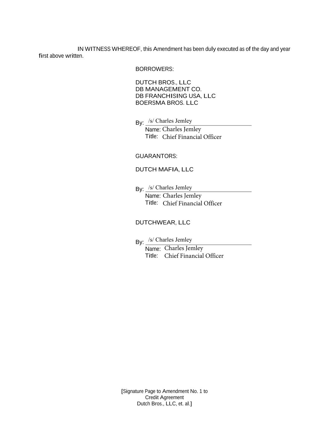 [Signature Page to Amendment No. 1 to Credit Agreement Dutch Bros., LLC, et. al.] IN WITNESS WHEREOF, this Amendment has been duly executed as of the day and year first above written. BORROWERS: DUTCH BROS., LLC DB MANAGEMENT CO. DB FRANCHISING USA, LLC BOERSMA BROS. LLC By: Name: Title: GUARANTORS: DUTCH MAFIA, LLC By: Name: Title: DUTCHWEAR, LLC By: Name: Title: Charles Jemley Chief Financial Officer Charles Jemley Chief Financial Officer Charles Jemley Chief Financial Officer /s/ Charles Jemley /s/ Charles Jemley /s/ Charles Jemley