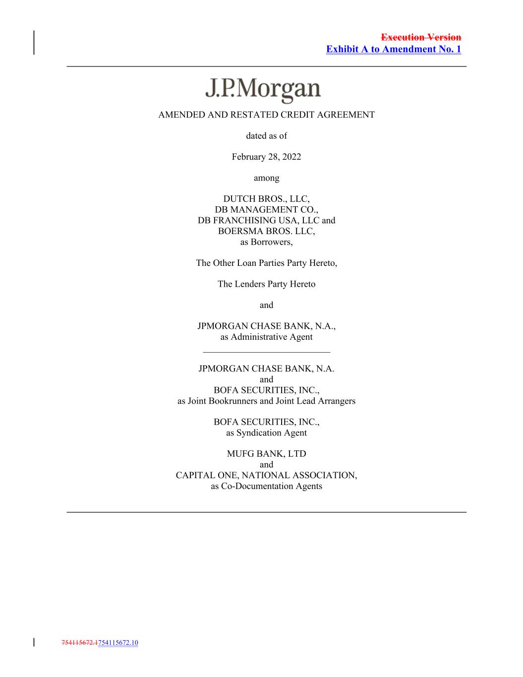 Execution Version Exhibit A to Amendment No. 1 754115672.1754115672.10 AMENDED AND RESTATED CREDIT AGREEMENT dated as of February 28, 2022 among DUTCH BROS., LLC, DB MANAGEMENT CO., DB FRANCHISING USA, LLC and BOERSMA BROS. LLC, as Borrowers, The Other Loan Parties Party Hereto, The Lenders Party Hereto and JPMORGAN CHASE BANK, N.A., as Administrative Agent ___________________________ JPMORGAN CHASE BANK, N.A. and BOFA SECURITIES, INC., as Joint Bookrunners and Joint Lead Arrangers BOFA SECURITIES, INC., as Syndication Agent MUFG BANK, LTD and CAPITAL ONE, NATIONAL ASSOCIATION, as Co-Documentation Agents