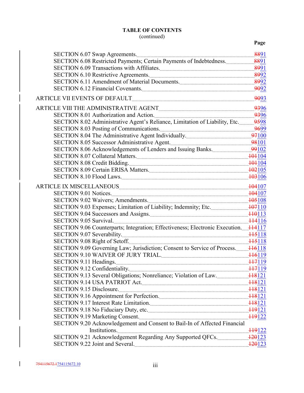 TABLE OF CONTENTS (continued) Page iii754115672.1754115672.10 SECTION 6.07 Swap Agreements. 8891 SECTION 6.08 Restricted Payments; Certain Payments of Indebtedness. 8891 SECTION 6.09 Transactions with Affiliates. 8991 SECTION 6.10 Restrictive Agreements. 8992 SECTION 6.11 Amendment of Material Documents. 8992 SECTION 6.12 Financial Covenants. 9092 ARTICLE VII EVENTS OF DEFAULT 9093 ARTICLE VIII THE ADMINISTRATIVE AGENT 9396 SECTION 8.01 Authorization and Action. 9396 SECTION 8.02 Administrative Agent’s Reliance, Limitation of Liability, Etc. 9598 SECTION 8.03 Posting of Communications. 9699 SECTION 8.04 The Administrative Agent Individually. 97100 SECTION 8.05 Successor Administrative Agent. 98101 SECTION 8.06 Acknowledgements of Lenders and Issuing Banks. 99102 SECTION 8.07 Collateral Matters. 101104 SECTION 8.08 Credit Bidding. 101104 SECTION 8.09 Certain ERISA Matters. 102105 SECTION 8.10 Flood Laws. 103106 ARTICLE IX MISCELLANEOUS 104107 SECTION 9.01 Notices. 104107 SECTION 9.02 Waivers; Amendments. 105108 SECTION 9.03 Expenses; Limitation of Liability; Indemnity; Etc. 107110 SECTION 9.04 Successors and Assigns. 110113 SECTION 9.05 Survival. 114116 SECTION 9.06 Counterparts; Integration; Effectiveness; Electronic Execution. 114117 SECTION 9.07 Severability. 115118 SECTION 9.08 Right of Setoff. 115118 SECTION 9.09 Governing Law; Jurisdiction; Consent to Service of Process. 116118 SECTION 9.10 WAIVER OF JURY TRIAL. 116119 SECTION 9.11 Headings. 117119 SECTION 9.12 Confidentiality. 117119 SECTION 9.13 Several Obligations; Nonreliance; Violation of Law. 118121 SECTION 9.14 USA PATRIOT Act. 118121 SECTION 9.15 Disclosure. 118121 SECTION 9.16 Appointment for Perfection. 118121 SECTION 9.17 Interest Rate Limitation. 118121 SECTION 9.18 No Fiduciary Duty, etc. 119121 SECTION 9.19 Marketing Consent. 119122 SECTION 9.20 Acknowledgement and Consent to Bail-In of Affected Financial Institutions. 119122 SECTION 9.21 Acknowledgement Regarding Any Supported QFCs. 120123 SECTION 9.22 Joint and Several. 120123