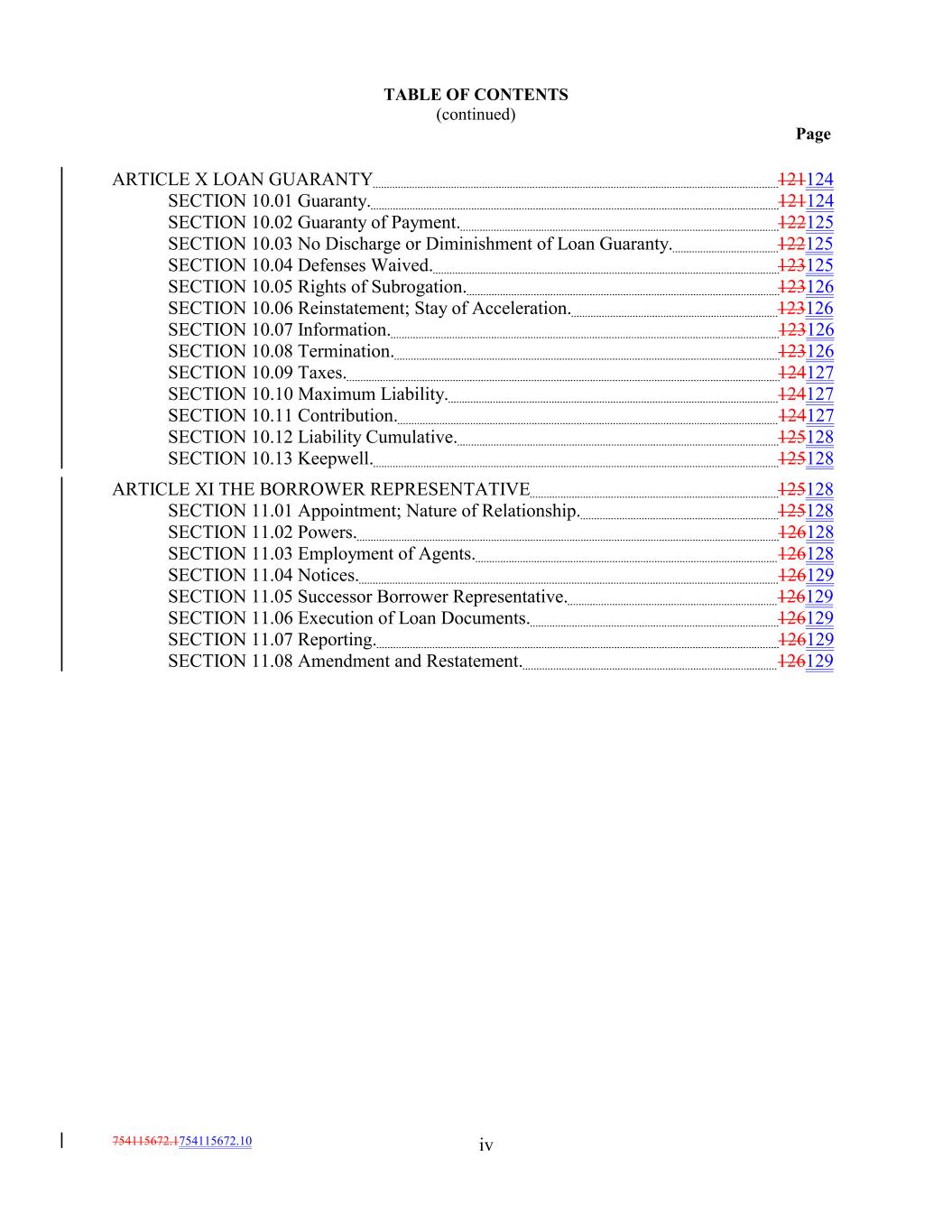 TABLE OF CONTENTS (continued) Page iv754115672.1754115672.10 ARTICLE X LOAN GUARANTY 121124 SECTION 10.01 Guaranty. 121124 SECTION 10.02 Guaranty of Payment. 122125 SECTION 10.03 No Discharge or Diminishment of Loan Guaranty. 122125 SECTION 10.04 Defenses Waived. 123125 SECTION 10.05 Rights of Subrogation. 123126 SECTION 10.06 Reinstatement; Stay of Acceleration. 123126 SECTION 10.07 Information. 123126 SECTION 10.08 Termination. 123126 SECTION 10.09 Taxes. 124127 SECTION 10.10 Maximum Liability. 124127 SECTION 10.11 Contribution. 124127 SECTION 10.12 Liability Cumulative. 125128 SECTION 10.13 Keepwell. 125128 ARTICLE XI THE BORROWER REPRESENTATIVE 125128 SECTION 11.01 Appointment; Nature of Relationship. 125128 SECTION 11.02 Powers. 126128 SECTION 11.03 Employment of Agents. 126128 SECTION 11.04 Notices. 126129 SECTION 11.05 Successor Borrower Representative. 126129 SECTION 11.06 Execution of Loan Documents. 126129 SECTION 11.07 Reporting. 126129 SECTION 11.08 Amendment and Restatement. 126129