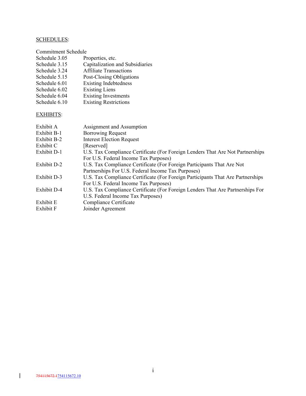 SCHEDULES: Commitment Schedule Schedule 3.05 Properties, etc. Schedule 3.15 Capitalization and Subsidiaries Schedule 3.24 Affiliate Transactions Schedule 5.15 Post-Closing Obligations Schedule 6.01 Existing Indebtedness Schedule 6.02 Existing Liens Schedule 6.04 Existing Investments Schedule 6.10 Existing Restrictions EXHIBITS: Exhibit A Assignment and Assumption Exhibit B-1 Borrowing Request Exhibit B-2 Interest Election Request Exhibit C [Reserved] Exhibit D-1 U.S. Tax Compliance Certificate (For Foreign Lenders That Are Not Partnerships For U.S. Federal Income Tax Purposes) Exhibit D-2 U.S. Tax Compliance Certificate (For Foreign Participants That Are Not Partnerships For U.S. Federal Income Tax Purposes) Exhibit D-3 U.S. Tax Compliance Certificate (For Foreign Participants That Are Partnerships For U.S. Federal Income Tax Purposes) Exhibit D-4 U.S. Tax Compliance Certificate (For Foreign Lenders That Are Partnerships For U.S. Federal Income Tax Purposes) Exhibit E Compliance Certificate Exhibit F Joinder Agreement i 754115672.1754115672.10