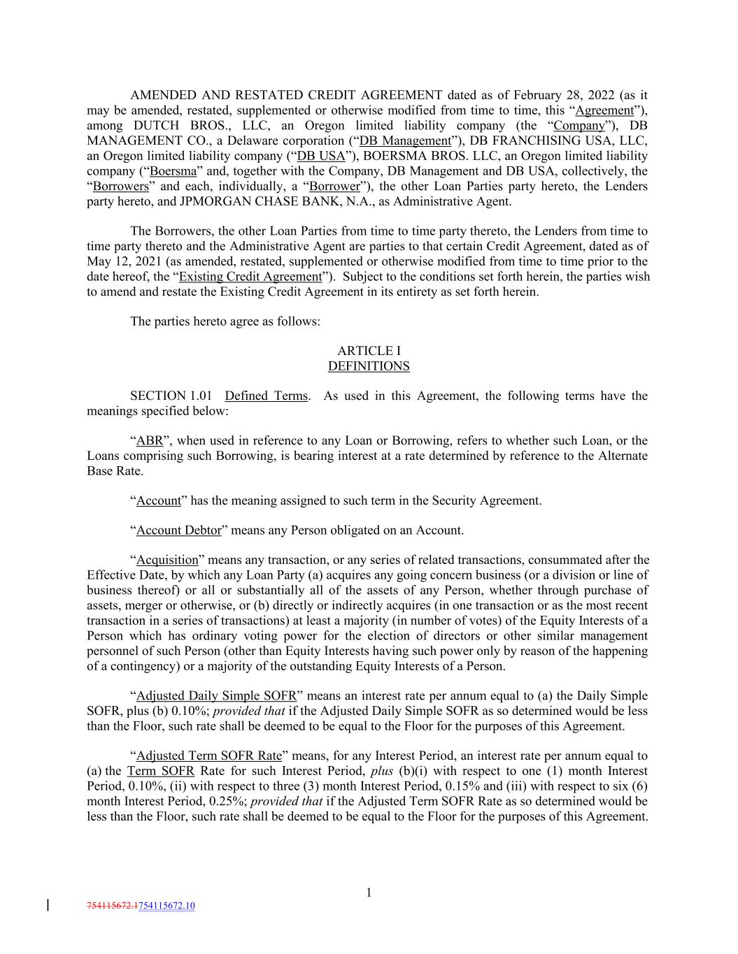 AMENDED AND RESTATED CREDIT AGREEMENT dated as of February 28, 2022 (as it may be amended, restated, supplemented or otherwise modified from time to time, this “Agreement”), among DUTCH BROS., LLC, an Oregon limited liability company (the “Company”), DB MANAGEMENT CO., a Delaware corporation (“DB Management”), DB FRANCHISING USA, LLC, an Oregon limited liability company (“DB USA”), BOERSMA BROS. LLC, an Oregon limited liability company (“Boersma” and, together with the Company, DB Management and DB USA, collectively, the “Borrowers” and each, individually, a “Borrower”), the other Loan Parties party hereto, the Lenders party hereto, and JPMORGAN CHASE BANK, N.A., as Administrative Agent. The Borrowers, the other Loan Parties from time to time party thereto, the Lenders from time to time party thereto and the Administrative Agent are parties to that certain Credit Agreement, dated as of May 12, 2021 (as amended, restated, supplemented or otherwise modified from time to time prior to the date hereof, the “Existing Credit Agreement”). Subject to the conditions set forth herein, the parties wish to amend and restate the Existing Credit Agreement in its entirety as set forth herein. The parties hereto agree as follows: ARTICLE I DEFINITIONS SECTION 1.01 Defined Terms. As used in this Agreement, the following terms have the meanings specified below: “ABR”, when used in reference to any Loan or Borrowing, refers to whether such Loan, or the Loans comprising such Borrowing, is bearing interest at a rate determined by reference to the Alternate Base Rate. “Account” has the meaning assigned to such term in the Security Agreement. “Account Debtor” means any Person obligated on an Account. “Acquisition” means any transaction, or any series of related transactions, consummated after the Effective Date, by which any Loan Party (a) acquires any going concern business (or a division or line of business thereof) or all or substantially all of the assets of any Person, whether through purchase of assets, merger or otherwise, or (b) directly or indirectly acquires (in one transaction or as the most recent transaction in a series of transactions) at least a majority (in number of votes) of the Equity Interests of a Person which has ordinary voting power for the election of directors or other similar management personnel of such Person (other than Equity Interests having such power only by reason of the happening of a contingency) or a majority of the outstanding Equity Interests of a Person. “Adjusted Daily Simple SOFR” means an interest rate per annum equal to (a) the Daily Simple SOFR, plus (b) 0.10%; provided that if the Adjusted Daily Simple SOFR as so determined would be less than the Floor, such rate shall be deemed to be equal to the Floor for the purposes of this Agreement. “Adjusted Term SOFR Rate” means, for any Interest Period, an interest rate per annum equal to (a) the Term SOFR Rate for such Interest Period, plus (b)(i) with respect to one (1) month Interest Period, 0.10%, (ii) with respect to three (3) month Interest Period, 0.15% and (iii) with respect to six (6) month Interest Period, 0.25%; provided that if the Adjusted Term SOFR Rate as so determined would be less than the Floor, such rate shall be deemed to be equal to the Floor for the purposes of this Agreement. 1 754115672.1754115672.10