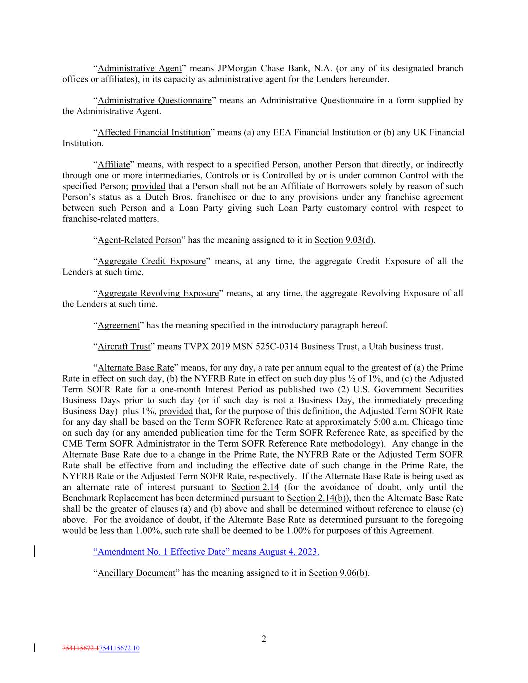 “Administrative Agent” means JPMorgan Chase Bank, N.A. (or any of its designated branch offices or affiliates), in its capacity as administrative agent for the Lenders hereunder. “Administrative Questionnaire” means an Administrative Questionnaire in a form supplied by the Administrative Agent. “Affected Financial Institution” means (a) any EEA Financial Institution or (b) any UK Financial Institution. “Affiliate” means, with respect to a specified Person, another Person that directly, or indirectly through one or more intermediaries, Controls or is Controlled by or is under common Control with the specified Person; provided that a Person shall not be an Affiliate of Borrowers solely by reason of such Person’s status as a Dutch Bros. franchisee or due to any provisions under any franchise agreement between such Person and a Loan Party giving such Loan Party customary control with respect to franchise-related matters. “Agent-Related Person” has the meaning assigned to it in Section 9.03(d). “Aggregate Credit Exposure” means, at any time, the aggregate Credit Exposure of all the Lenders at such time. “Aggregate Revolving Exposure” means, at any time, the aggregate Revolving Exposure of all the Lenders at such time. “Agreement” has the meaning specified in the introductory paragraph hereof. “Aircraft Trust” means TVPX 2019 MSN 525C-0314 Business Trust, a Utah business trust. “Alternate Base Rate” means, for any day, a rate per annum equal to the greatest of (a) the Prime Rate in effect on such day, (b) the NYFRB Rate in effect on such day plus ½ of 1%, and (c) the Adjusted Term SOFR Rate for a one-month Interest Period as published two (2) U.S. Government Securities Business Days prior to such day (or if such day is not a Business Day, the immediately preceding Business Day) plus 1%, provided that, for the purpose of this definition, the Adjusted Term SOFR Rate for any day shall be based on the Term SOFR Reference Rate at approximately 5:00 a.m. Chicago time on such day (or any amended publication time for the Term SOFR Reference Rate, as specified by the CME Term SOFR Administrator in the Term SOFR Reference Rate methodology). Any change in the Alternate Base Rate due to a change in the Prime Rate, the NYFRB Rate or the Adjusted Term SOFR Rate shall be effective from and including the effective date of such change in the Prime Rate, the NYFRB Rate or the Adjusted Term SOFR Rate, respectively. If the Alternate Base Rate is being used as an alternate rate of interest pursuant to Section 2.14 (for the avoidance of doubt, only until the Benchmark Replacement has been determined pursuant to Section 2.14(b)), then the Alternate Base Rate shall be the greater of clauses (a) and (b) above and shall be determined without reference to clause (c) above. For the avoidance of doubt, if the Alternate Base Rate as determined pursuant to the foregoing would be less than 1.00%, such rate shall be deemed to be 1.00% for purposes of this Agreement. “Amendment No. 1 Effective Date” means August 4, 2023. “Ancillary Document” has the meaning assigned to it in Section 9.06(b). 2 754115672.1754115672.10