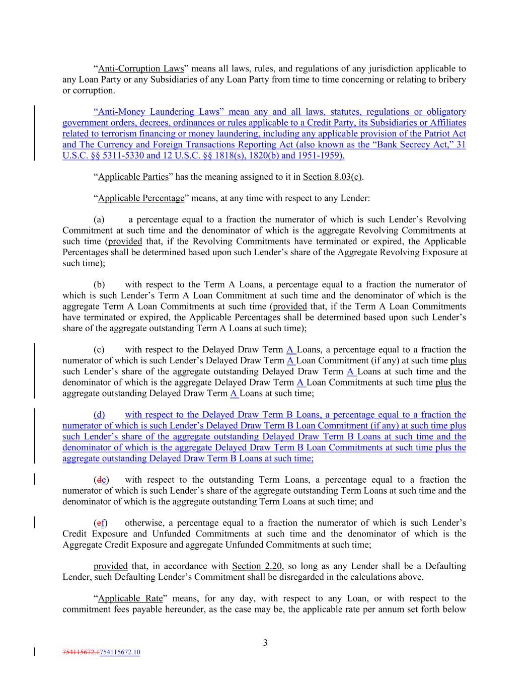 “Anti-Corruption Laws” means all laws, rules, and regulations of any jurisdiction applicable to any Loan Party or any Subsidiaries of any Loan Party from time to time concerning or relating to bribery or corruption. “Anti-Money Laundering Laws” mean any and all laws, statutes, regulations or obligatory government orders, decrees, ordinances or rules applicable to a Credit Party, its Subsidiaries or Affiliates related to terrorism financing or money laundering, including any applicable provision of the Patriot Act and The Currency and Foreign Transactions Reporting Act (also known as the “Bank Secrecy Act,” 31 U.S.C. §§ 5311-5330 and 12 U.S.C. §§ 1818(s), 1820(b) and 1951-1959). “Applicable Parties” has the meaning assigned to it in Section 8.03(c). “Applicable Percentage” means, at any time with respect to any Lender: (a) a percentage equal to a fraction the numerator of which is such Lender’s Revolving Commitment at such time and the denominator of which is the aggregate Revolving Commitments at such time (provided that, if the Revolving Commitments have terminated or expired, the Applicable Percentages shall be determined based upon such Lender’s share of the Aggregate Revolving Exposure at such time); (b) with respect to the Term A Loans, a percentage equal to a fraction the numerator of which is such Lender’s Term A Loan Commitment at such time and the denominator of which is the aggregate Term A Loan Commitments at such time (provided that, if the Term A Loan Commitments have terminated or expired, the Applicable Percentages shall be determined based upon such Lender’s share of the aggregate outstanding Term A Loans at such time); (c) with respect to the Delayed Draw Term A Loans, a percentage equal to a fraction the numerator of which is such Lender’s Delayed Draw Term A Loan Commitment (if any) at such time plus such Lender’s share of the aggregate outstanding Delayed Draw Term A Loans at such time and the denominator of which is the aggregate Delayed Draw Term A Loan Commitments at such time plus the aggregate outstanding Delayed Draw Term A Loans at such time; (d) with respect to the Delayed Draw Term B Loans, a percentage equal to a fraction the numerator of which is such Lender’s Delayed Draw Term B Loan Commitment (if any) at such time plus such Lender’s share of the aggregate outstanding Delayed Draw Term B Loans at such time and the denominator of which is the aggregate Delayed Draw Term B Loan Commitments at such time plus the aggregate outstanding Delayed Draw Term B Loans at such time; (de) with respect to the outstanding Term Loans, a percentage equal to a fraction the numerator of which is such Lender’s share of the aggregate outstanding Term Loans at such time and the denominator of which is the aggregate outstanding Term Loans at such time; and (ef) otherwise, a percentage equal to a fraction the numerator of which is such Lender’s Credit Exposure and Unfunded Commitments at such time and the denominator of which is the Aggregate Credit Exposure and aggregate Unfunded Commitments at such time; provided that, in accordance with Section 2.20, so long as any Lender shall be a Defaulting Lender, such Defaulting Lender’s Commitment shall be disregarded in the calculations above. “Applicable Rate” means, for any day, with respect to any Loan, or with respect to the commitment fees payable hereunder, as the case may be, the applicable rate per annum set forth below 3 754115672.1754115672.10