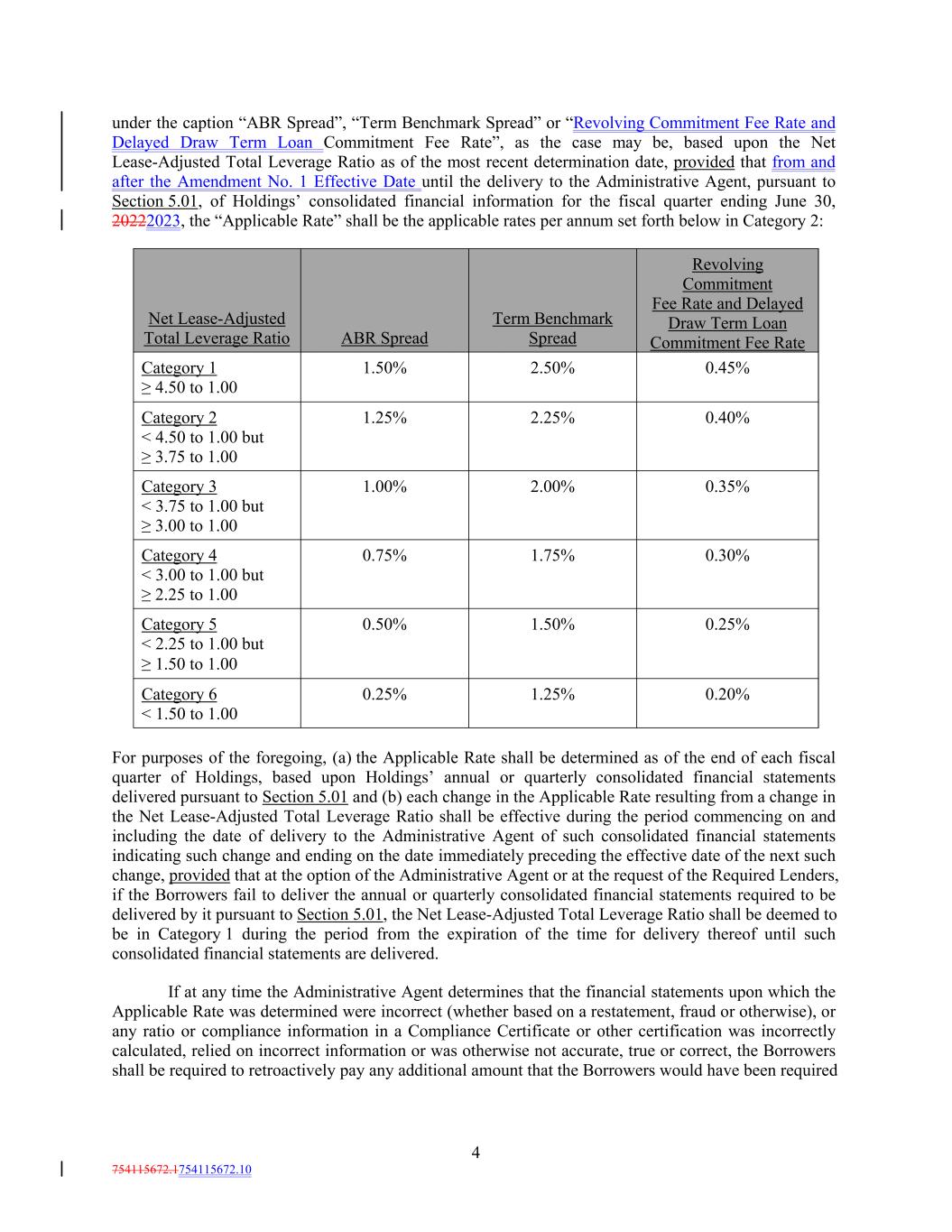 4 754115672.1754115672.10 1.00% 1.50% 2.00% ABR Spread 0.35% 2.50% under the caption “ABR Spread”, “Term Benchmark Spread” or “Revolving Commitment Fee Rate and Delayed Draw Term Loan Commitment Fee Rate”, as the case may be, based upon the Net Lease-Adjusted Total Leverage Ratio as of the most recent determination date, provided that from and after the Amendment No. 1 Effective Date until the delivery to the Administrative Agent, pursuant to Section 5.01, of Holdings’ consolidated financial information for the fiscal quarter ending June 30, 20222023, the “Applicable Rate” shall be the applicable rates per annum set forth below in Category 2: Category 4 < 3.00 to 1.00 but ≥ 2.25 to 1.00 0.45% 0.75% Term Benchmark Spread 1.75% 0.30% Category 2 < 4.50 to 1.00 but ≥ 3.75 to 1.00 Category 5 < 2.25 to 1.00 but ≥ 1.50 to 1.00 Revolving Commitment Fee Rate and Delayed Draw Term Loan Commitment Fee Rate 0.50% 1.25% 1.50% 0.25% 2.25% Category 6 < 1.50 to 1.00 0.40% 0.25% Net Lease-Adjusted Total Leverage Ratio 1.25% 0.20% Category 1 ≥ 4.50 to 1.00 For purposes of the foregoing, (a) the Applicable Rate shall be determined as of the end of each fiscal quarter of Holdings, based upon Holdings’ annual or quarterly consolidated financial statements delivered pursuant to Section 5.01 and (b) each change in the Applicable Rate resulting from a change in the Net Lease-Adjusted Total Leverage Ratio shall be effective during the period commencing on and including the date of delivery to the Administrative Agent of such consolidated financial statements indicating such change and ending on the date immediately preceding the effective date of the next such change, provided that at the option of the Administrative Agent or at the request of the Required Lenders, if the Borrowers fail to deliver the annual or quarterly consolidated financial statements required to be delivered by it pursuant to Section 5.01, the Net Lease-Adjusted Total Leverage Ratio shall be deemed to be in Category 1 during the period from the expiration of the time for delivery thereof until such consolidated financial statements are delivered. If at any time the Administrative Agent determines that the financial statements upon which the Applicable Rate was determined were incorrect (whether based on a restatement, fraud or otherwise), or any ratio or compliance information in a Compliance Certificate or other certification was incorrectly calculated, relied on incorrect information or was otherwise not accurate, true or correct, the Borrowers shall be required to retroactively pay any additional amount that the Borrowers would have been required Category 3 < 3.75 to 1.00 but ≥ 3.00 to 1.00