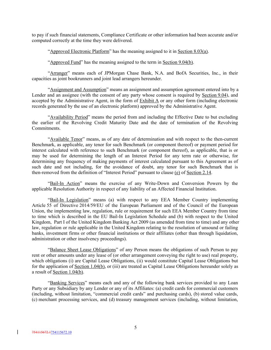 to pay if such financial statements, Compliance Certificate or other information had been accurate and/or computed correctly at the time they were delivered. “Approved Electronic Platform” has the meaning assigned to it in Section 8.03(a). “Approved Fund” has the meaning assigned to the term in Section 9.04(b). “Arranger” means each of JPMorgan Chase Bank, N.A. and BofA Securities, Inc., in their capacities as joint bookrunners and joint lead arrangers hereunder. “Assignment and Assumption” means an assignment and assumption agreement entered into by a Lender and an assignee (with the consent of any party whose consent is required by Section 9.04), and accepted by the Administrative Agent, in the form of Exhibit A or any other form (including electronic records generated by the use of an electronic platform) approved by the Administrative Agent. “Availability Period” means the period from and including the Effective Date to but excluding the earlier of the Revolving Credit Maturity Date and the date of termination of the Revolving Commitments. “Available Tenor” means, as of any date of determination and with respect to the then-current Benchmark, as applicable, any tenor for such Benchmark (or component thereof) or payment period for interest calculated with reference to such Benchmark (or component thereof), as applicable, that is or may be used for determining the length of an Interest Period for any term rate or otherwise, for determining any frequency of making payments of interest calculated pursuant to this Agreement as of such date and not including, for the avoidance of doubt, any tenor for such Benchmark that is then-removed from the definition of “Interest Period” pursuant to clause (e) of Section 2.14. “Bail-In Action” means the exercise of any Write-Down and Conversion Powers by the applicable Resolution Authority in respect of any liability of an Affected Financial Institution. “Bail-In Legislation” means (a) with respect to any EEA Member Country implementing Article 55 of Directive 2014/59/EU of the European Parliament and of the Council of the European Union, the implementing law, regulation, rule or requirement for such EEA Member Country from time to time which is described in the EU Bail-In Legislation Schedule and (b) with respect to the United Kingdom, Part I of the United Kingdom Banking Act 2009 (as amended from time to time) and any other law, regulation or rule applicable in the United Kingdom relating to the resolution of unsound or failing banks, investment firms or other financial institutions or their affiliates (other than through liquidation, administration or other insolvency proceedings). “Balance Sheet Lease Obligations” of any Person means the obligations of such Person to pay rent or other amounts under any lease of (or other arrangement conveying the right to use) real property, which obligations (i) are Capital Lease Obligations, (ii) would constitute Capital Lease Obligations but for the application of Section 1.04(b), or (iii) are treated as Capital Lease Obligations hereunder solely as a result of Section 1.04(b). “Banking Services” means each and any of the following bank services provided to any Loan Party or any Subsidiary by any Lender or any of its Affiliates: (a) credit cards for commercial customers (including, without limitation, “commercial credit cards” and purchasing cards), (b) stored value cards, (c) merchant processing services, and (d) treasury management services (including, without limitation, 5 754115672.1754115672.10