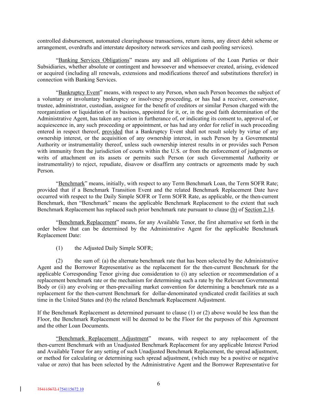 controlled disbursement, automated clearinghouse transactions, return items, any direct debit scheme or arrangement, overdrafts and interstate depository network services and cash pooling services). “Banking Services Obligations” means any and all obligations of the Loan Parties or their Subsidiaries, whether absolute or contingent and howsoever and whensoever created, arising, evidenced or acquired (including all renewals, extensions and modifications thereof and substitutions therefor) in connection with Banking Services. “Bankruptcy Event” means, with respect to any Person, when such Person becomes the subject of a voluntary or involuntary bankruptcy or insolvency proceeding, or has had a receiver, conservator, trustee, administrator, custodian, assignee for the benefit of creditors or similar Person charged with the reorganization or liquidation of its business, appointed for it, or, in the good faith determination of the Administrative Agent, has taken any action in furtherance of, or indicating its consent to, approval of, or acquiescence in, any such proceeding or appointment, or has had any order for relief in such proceeding entered in respect thereof, provided that a Bankruptcy Event shall not result solely by virtue of any ownership interest, or the acquisition of any ownership interest, in such Person by a Governmental Authority or instrumentality thereof, unless such ownership interest results in or provides such Person with immunity from the jurisdiction of courts within the U.S. or from the enforcement of judgments or writs of attachment on its assets or permits such Person (or such Governmental Authority or instrumentality) to reject, repudiate, disavow or disaffirm any contracts or agreements made by such Person. “Benchmark” means, initially, with respect to any Term Benchmark Loan, the Term SOFR Rate; provided that if a Benchmark Transition Event and the related Benchmark Replacement Date have occurred with respect to the Daily Simple SOFR or Term SOFR Rate, as applicable, or the then-current Benchmark, then “Benchmark” means the applicable Benchmark Replacement to the extent that such Benchmark Replacement has replaced such prior benchmark rate pursuant to clause (b) of Section 2.14. “Benchmark Replacement” means, for any Available Tenor, the first alternative set forth in the order below that can be determined by the Administrative Agent for the applicable Benchmark Replacement Date: (1) the Adjusted Daily Simple SOFR; (2) the sum of: (a) the alternate benchmark rate that has been selected by the Administrative Agent and the Borrower Representative as the replacement for the then-current Benchmark for the applicable Corresponding Tenor giving due consideration to (i) any selection or recommendation of a replacement benchmark rate or the mechanism for determining such a rate by the Relevant Governmental Body or (ii) any evolving or then-prevailing market convention for determining a benchmark rate as a replacement for the then-current Benchmark for dollar-denominated syndicated credit facilities at such time in the United States and (b) the related Benchmark Replacement Adjustment. If the Benchmark Replacement as determined pursuant to clause (1) or (2) above would be less than the Floor, the Benchmark Replacement will be deemed to be the Floor for the purposes of this Agreement and the other Loan Documents. “Benchmark Replacement Adjustment” means, with respect to any replacement of the then-current Benchmark with an Unadjusted Benchmark Replacement for any applicable Interest Period and Available Tenor for any setting of such Unadjusted Benchmark Replacement, the spread adjustment, or method for calculating or determining such spread adjustment, (which may be a positive or negative value or zero) that has been selected by the Administrative Agent and the Borrower Representative for 6 754115672.1754115672.10