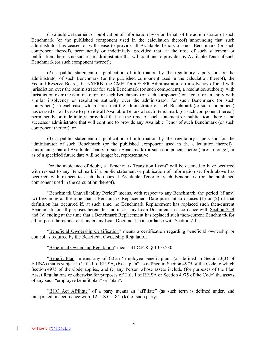 (1) a public statement or publication of information by or on behalf of the administrator of such Benchmark (or the published component used in the calculation thereof) announcing that such administrator has ceased or will cease to provide all Available Tenors of such Benchmark (or such component thereof), permanently or indefinitely, provided that, at the time of such statement or publication, there is no successor administrator that will continue to provide any Available Tenor of such Benchmark (or such component thereof); (2) a public statement or publication of information by the regulatory supervisor for the administrator of such Benchmark (or the published component used in the calculation thereof), the Federal Reserve Board, the NYFRB, the CME Term SOFR Administrator, an insolvency official with jurisdiction over the administrator for such Benchmark (or such component), a resolution authority with jurisdiction over the administrator for such Benchmark (or such component) or a court or an entity with similar insolvency or resolution authority over the administrator for such Benchmark (or such component), in each case, which states that the administrator of such Benchmark (or such component) has ceased or will cease to provide all Available Tenors of such Benchmark (or such component thereof) permanently or indefinitely; provided that, at the time of such statement or publication, there is no successor administrator that will continue to provide any Available Tenor of such Benchmark (or such component thereof); or (3) a public statement or publication of information by the regulatory supervisor for the administrator of such Benchmark (or the published component used in the calculation thereof) announcing that all Available Tenors of such Benchmark (or such component thereof) are no longer, or as of a specified future date will no longer be, representative. For the avoidance of doubt, a “Benchmark Transition Event” will be deemed to have occurred with respect to any Benchmark if a public statement or publication of information set forth above has occurred with respect to each then-current Available Tenor of such Benchmark (or the published component used in the calculation thereof). “Benchmark Unavailability Period” means, with respect to any Benchmark, the period (if any) (x) beginning at the time that a Benchmark Replacement Date pursuant to clauses (1) or (2) of that definition has occurred if, at such time, no Benchmark Replacement has replaced such then-current Benchmark for all purposes hereunder and under any Loan Document in accordance with Section 2.14 and (y) ending at the time that a Benchmark Replacement has replaced such then-current Benchmark for all purposes hereunder and under any Loan Document in accordance with Section 2.14. “Beneficial Ownership Certification” means a certification regarding beneficial ownership or control as required by the Beneficial Ownership Regulation. “Beneficial Ownership Regulation” means 31 C.F.R. § 1010.230. “Benefit Plan” means any of (a) an “employee benefit plan” (as defined in Section 3(3) of ERISA) that is subject to Title I of ERISA, (b) a “plan” as defined in Section 4975 of the Code to which Section 4975 of the Code applies, and (c) any Person whose assets include (for purposes of the Plan Asset Regulations or otherwise for purposes of Title I of ERISA or Section 4975 of the Code) the assets of any such “employee benefit plan” or “plan”. “BHC Act Affiliate” of a party means an “affiliate” (as such term is defined under, and interpreted in accordance with, 12 U.S.C. 1841(k)) of such party. 8 754115672.1754115672.10