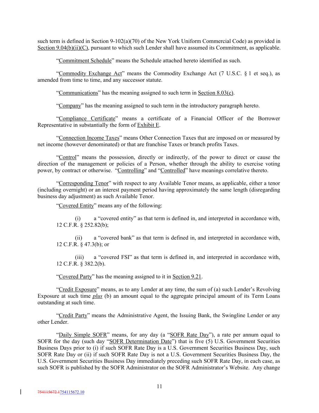 such term is defined in Section 9-102(a)(70) of the New York Uniform Commercial Code) as provided in Section 9.04(b)(ii)(C), pursuant to which such Lender shall have assumed its Commitment, as applicable. “Commitment Schedule” means the Schedule attached hereto identified as such. “Commodity Exchange Act” means the Commodity Exchange Act (7 U.S.C. § 1 et seq.), as amended from time to time, and any successor statute. “Communications” has the meaning assigned to such term in Section 8.03(c). “Company” has the meaning assigned to such term in the introductory paragraph hereto. “Compliance Certificate” means a certificate of a Financial Officer of the Borrower Representative in substantially the form of Exhibit E. “Connection Income Taxes” means Other Connection Taxes that are imposed on or measured by net income (however denominated) or that are franchise Taxes or branch profits Taxes. “Control” means the possession, directly or indirectly, of the power to direct or cause the direction of the management or policies of a Person, whether through the ability to exercise voting power, by contract or otherwise. “Controlling” and “Controlled” have meanings correlative thereto. “Corresponding Tenor” with respect to any Available Tenor means, as applicable, either a tenor (including overnight) or an interest payment period having approximately the same length (disregarding business day adjustment) as such Available Tenor. “Covered Entity” means any of the following: (i) a “covered entity” as that term is defined in, and interpreted in accordance with, 12 C.F.R. § 252.82(b); (ii) a “covered bank” as that term is defined in, and interpreted in accordance with, 12 C.F.R. § 47.3(b); or (iii) a “covered FSI” as that term is defined in, and interpreted in accordance with, 12 C.F.R. § 382.2(b). “Covered Party” has the meaning assigned to it in Section 9.21. “Credit Exposure” means, as to any Lender at any time, the sum of (a) such Lender’s Revolving Exposure at such time plus (b) an amount equal to the aggregate principal amount of its Term Loans outstanding at such time. “Credit Party” means the Administrative Agent, the Issuing Bank, the Swingline Lender or any other Lender. “Daily Simple SOFR” means, for any day (a “SOFR Rate Day”), a rate per annum equal to SOFR for the day (such day “SOFR Determination Date”) that is five (5) U.S. Government Securities Business Days prior to (i) if such SOFR Rate Day is a U.S. Government Securities Business Day, such SOFR Rate Day or (ii) if such SOFR Rate Day is not a U.S. Government Securities Business Day, the U.S. Government Securities Business Day immediately preceding such SOFR Rate Day, in each case, as such SOFR is published by the SOFR Administrator on the SOFR Administrator’s Website. Any change 11 754115672.1754115672.10