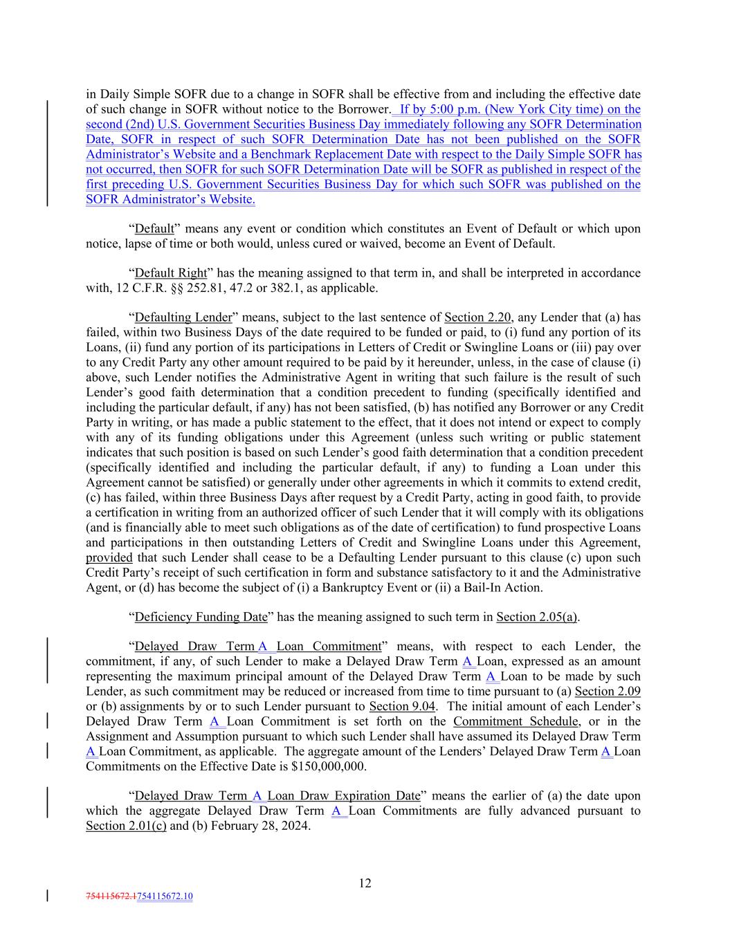 in Daily Simple SOFR due to a change in SOFR shall be effective from and including the effective date of such change in SOFR without notice to the Borrower. If by 5:00 p.m. (New York City time) on the second (2nd) U.S. Government Securities Business Day immediately following any SOFR Determination Date, SOFR in respect of such SOFR Determination Date has not been published on the SOFR Administrator’s Website and a Benchmark Replacement Date with respect to the Daily Simple SOFR has not occurred, then SOFR for such SOFR Determination Date will be SOFR as published in respect of the first preceding U.S. Government Securities Business Day for which such SOFR was published on the SOFR Administrator’s Website. “Default” means any event or condition which constitutes an Event of Default or which upon notice, lapse of time or both would, unless cured or waived, become an Event of Default. “Default Right” has the meaning assigned to that term in, and shall be interpreted in accordance with, 12 C.F.R. §§ 252.81, 47.2 or 382.1, as applicable. “Defaulting Lender” means, subject to the last sentence of Section 2.20, any Lender that (a) has failed, within two Business Days of the date required to be funded or paid, to (i) fund any portion of its Loans, (ii) fund any portion of its participations in Letters of Credit or Swingline Loans or (iii) pay over to any Credit Party any other amount required to be paid by it hereunder, unless, in the case of clause (i) above, such Lender notifies the Administrative Agent in writing that such failure is the result of such Lender’s good faith determination that a condition precedent to funding (specifically identified and including the particular default, if any) has not been satisfied, (b) has notified any Borrower or any Credit Party in writing, or has made a public statement to the effect, that it does not intend or expect to comply with any of its funding obligations under this Agreement (unless such writing or public statement indicates that such position is based on such Lender’s good faith determination that a condition precedent (specifically identified and including the particular default, if any) to funding a Loan under this Agreement cannot be satisfied) or generally under other agreements in which it commits to extend credit, (c) has failed, within three Business Days after request by a Credit Party, acting in good faith, to provide a certification in writing from an authorized officer of such Lender that it will comply with its obligations (and is financially able to meet such obligations as of the date of certification) to fund prospective Loans and participations in then outstanding Letters of Credit and Swingline Loans under this Agreement, provided that such Lender shall cease to be a Defaulting Lender pursuant to this clause (c) upon such Credit Party’s receipt of such certification in form and substance satisfactory to it and the Administrative Agent, or (d) has become the subject of (i) a Bankruptcy Event or (ii) a Bail-In Action. “Deficiency Funding Date” has the meaning assigned to such term in Section 2.05(a). “Delayed Draw Term A Loan Commitment” means, with respect to each Lender, the commitment, if any, of such Lender to make a Delayed Draw Term A Loan, expressed as an amount representing the maximum principal amount of the Delayed Draw Term A Loan to be made by such Lender, as such commitment may be reduced or increased from time to time pursuant to (a) Section 2.09 or (b) assignments by or to such Lender pursuant to Section 9.04. The initial amount of each Lender’s Delayed Draw Term A Loan Commitment is set forth on the Commitment Schedule, or in the Assignment and Assumption pursuant to which such Lender shall have assumed its Delayed Draw Term A Loan Commitment, as applicable. The aggregate amount of the Lenders’ Delayed Draw Term A Loan Commitments on the Effective Date is $150,000,000. “Delayed Draw Term A Loan Draw Expiration Date” means the earlier of (a) the date upon which the aggregate Delayed Draw Term A Loan Commitments are fully advanced pursuant to Section 2.01(c) and (b) February 28, 2024. 12 754115672.1754115672.10