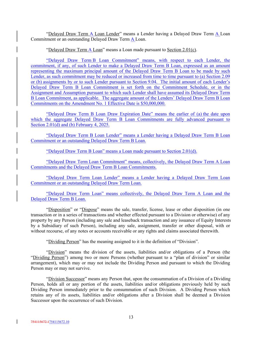 “Delayed Draw Term A Loan Lender” means a Lender having a Delayed Draw Term A Loan Commitment or an outstanding Delayed Draw Term A Loan. “Delayed Draw Term A Loan” means a Loan made pursuant to Section 2.01(c). “Delayed Draw Term B Loan Commitment” means, with respect to each Lender, the commitment, if any, of such Lender to make a Delayed Draw Term B Loan, expressed as an amount representing the maximum principal amount of the Delayed Draw Term B Loan to be made by such Lender, as such commitment may be reduced or increased from time to time pursuant to (a) Section 2.09 or (b) assignments by or to such Lender pursuant to Section 9.04. The initial amount of each Lender’s Delayed Draw Term B Loan Commitment is set forth on the Commitment Schedule, or in the Assignment and Assumption pursuant to which such Lender shall have assumed its Delayed Draw Term B Loan Commitment, as applicable. The aggregate amount of the Lenders’ Delayed Draw Term B Loan Commitments on the Amendment No. 1 Effective Date is $50,000,000. “Delayed Draw Term B Loan Draw Expiration Date” means the earlier of (a) the date upon which the aggregate Delayed Draw Term B Loan Commitments are fully advanced pursuant to Section 2.01(d) and (b) February 4, 2025. “Delayed Draw Term B Loan Lender” means a Lender having a Delayed Draw Term B Loan Commitment or an outstanding Delayed Draw Term B Loan. “Delayed Draw Term B Loan” means a Loan made pursuant to Section 2.01(d). “Delayed Draw Term Loan Commitment” means, collectively, the Delayed Draw Term A Loan Commitments and the Delayed Draw Term B Loan Commitments. “Delayed Draw Term Loan Lender” means a Lender having a Delayed Draw Term Loan Commitment or an outstanding Delayed Draw Term Loan. “Delayed Draw Term Loan” means collectively, the Delayed Draw Term A Loan and the Delayed Draw Term B Loan. “Disposition” or “Dispose” means the sale, transfer, license, lease or other disposition (in one transaction or in a series of transactions and whether effected pursuant to a Division or otherwise) of any property by any Person (including any sale and leaseback transaction and any issuance of Equity Interests by a Subsidiary of such Person), including any sale, assignment, transfer or other disposal, with or without recourse, of any notes or accounts receivable or any rights and claims associated therewith. “Dividing Person” has the meaning assigned to it in the definition of “Division”. “Division” means the division of the assets, liabilities and/or obligations of a Person (the “Dividing Person”) among two or more Persons (whether pursuant to a “plan of division” or similar arrangement), which may or may not include the Dividing Person and pursuant to which the Dividing Person may or may not survive. “Division Successor” means any Person that, upon the consummation of a Division of a Dividing Person, holds all or any portion of the assets, liabilities and/or obligations previously held by such Dividing Person immediately prior to the consummation of such Division. A Dividing Person which retains any of its assets, liabilities and/or obligations after a Division shall be deemed a Division Successor upon the occurrence of such Division. 13 754115672.1754115672.10