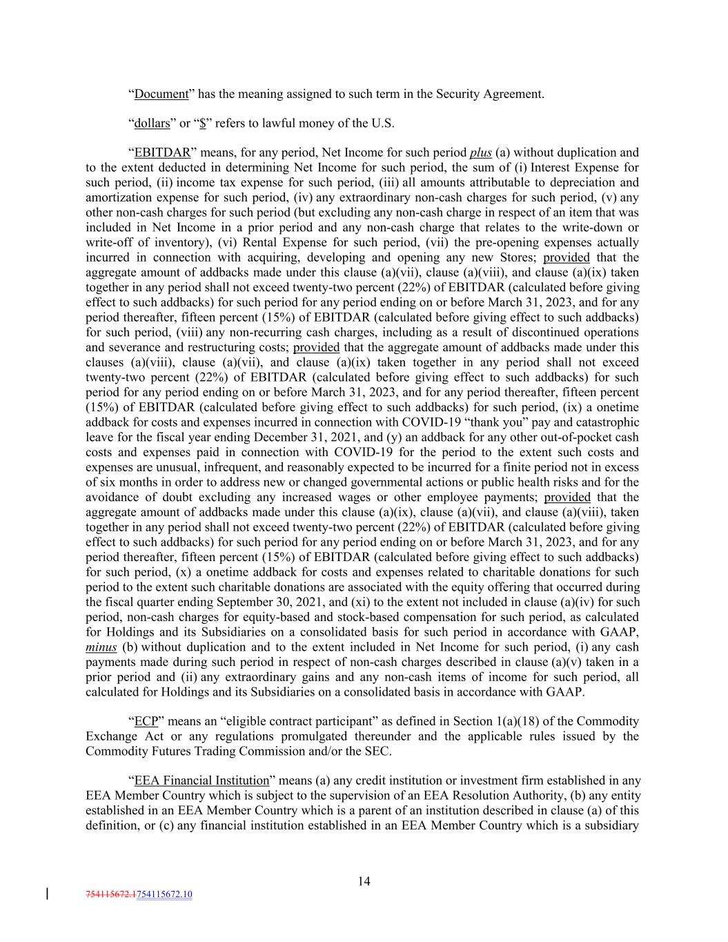 “Document” has the meaning assigned to such term in the Security Agreement. “dollars” or “$” refers to lawful money of the U.S. “EBITDAR” means, for any period, Net Income for such period plus (a) without duplication and to the extent deducted in determining Net Income for such period, the sum of (i) Interest Expense for such period, (ii) income tax expense for such period, (iii) all amounts attributable to depreciation and amortization expense for such period, (iv) any extraordinary non-cash charges for such period, (v) any other non-cash charges for such period (but excluding any non-cash charge in respect of an item that was included in Net Income in a prior period and any non-cash charge that relates to the write-down or write-off of inventory), (vi) Rental Expense for such period, (vii) the pre-opening expenses actually incurred in connection with acquiring, developing and opening any new Stores; provided that the aggregate amount of addbacks made under this clause (a)(vii), clause (a)(viii), and clause (a)(ix) taken together in any period shall not exceed twenty-two percent (22%) of EBITDAR (calculated before giving effect to such addbacks) for such period for any period ending on or before March 31, 2023, and for any period thereafter, fifteen percent (15%) of EBITDAR (calculated before giving effect to such addbacks) for such period, (viii) any non-recurring cash charges, including as a result of discontinued operations and severance and restructuring costs; provided that the aggregate amount of addbacks made under this clauses (a)(viii), clause (a)(vii), and clause (a)(ix) taken together in any period shall not exceed twenty-two percent (22%) of EBITDAR (calculated before giving effect to such addbacks) for such period for any period ending on or before March 31, 2023, and for any period thereafter, fifteen percent (15%) of EBITDAR (calculated before giving effect to such addbacks) for such period, (ix) a onetime addback for costs and expenses incurred in connection with COVID-19 “thank you” pay and catastrophic leave for the fiscal year ending December 31, 2021, and (y) an addback for any other out-of-pocket cash costs and expenses paid in connection with COVID-19 for the period to the extent such costs and expenses are unusual, infrequent, and reasonably expected to be incurred for a finite period not in excess of six months in order to address new or changed governmental actions or public health risks and for the avoidance of doubt excluding any increased wages or other employee payments; provided that the aggregate amount of addbacks made under this clause (a)(ix), clause (a)(vii), and clause (a)(viii), taken together in any period shall not exceed twenty-two percent (22%) of EBITDAR (calculated before giving effect to such addbacks) for such period for any period ending on or before March 31, 2023, and for any period thereafter, fifteen percent (15%) of EBITDAR (calculated before giving effect to such addbacks) for such period, (x) a onetime addback for costs and expenses related to charitable donations for such period to the extent such charitable donations are associated with the equity offering that occurred during the fiscal quarter ending September 30, 2021, and (xi) to the extent not included in clause (a)(iv) for such period, non-cash charges for equity-based and stock-based compensation for such period, as calculated for Holdings and its Subsidiaries on a consolidated basis for such period in accordance with GAAP, minus (b) without duplication and to the extent included in Net Income for such period, (i) any cash payments made during such period in respect of non-cash charges described in clause (a)(v) taken in a prior period and (ii) any extraordinary gains and any non-cash items of income for such period, all calculated for Holdings and its Subsidiaries on a consolidated basis in accordance with GAAP. “ECP” means an “eligible contract participant” as defined in Section 1(a)(18) of the Commodity Exchange Act or any regulations promulgated thereunder and the applicable rules issued by the Commodity Futures Trading Commission and/or the SEC. “EEA Financial Institution” means (a) any credit institution or investment firm established in any EEA Member Country which is subject to the supervision of an EEA Resolution Authority, (b) any entity established in an EEA Member Country which is a parent of an institution described in clause (a) of this definition, or (c) any financial institution established in an EEA Member Country which is a subsidiary 14 754115672.1754115672.10
