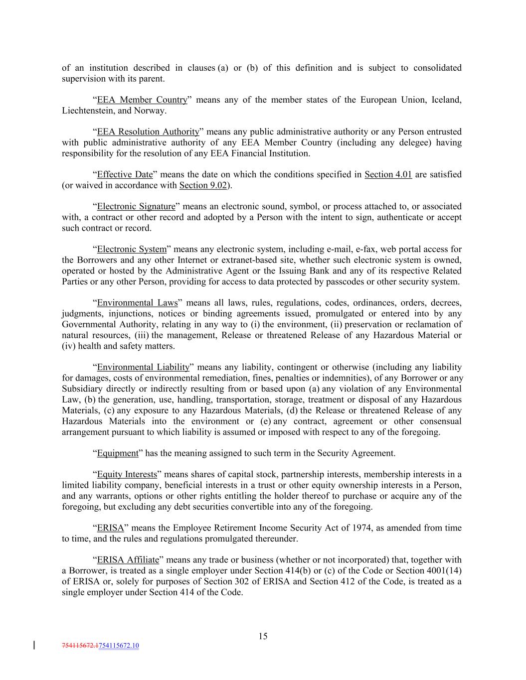 of an institution described in clauses (a) or (b) of this definition and is subject to consolidated supervision with its parent. “EEA Member Country” means any of the member states of the European Union, Iceland, Liechtenstein, and Norway. “EEA Resolution Authority” means any public administrative authority or any Person entrusted with public administrative authority of any EEA Member Country (including any delegee) having responsibility for the resolution of any EEA Financial Institution. “Effective Date” means the date on which the conditions specified in Section 4.01 are satisfied (or waived in accordance with Section 9.02). “Electronic Signature” means an electronic sound, symbol, or process attached to, or associated with, a contract or other record and adopted by a Person with the intent to sign, authenticate or accept such contract or record. “Electronic System” means any electronic system, including e-mail, e-fax, web portal access for the Borrowers and any other Internet or extranet-based site, whether such electronic system is owned, operated or hosted by the Administrative Agent or the Issuing Bank and any of its respective Related Parties or any other Person, providing for access to data protected by passcodes or other security system. “Environmental Laws” means all laws, rules, regulations, codes, ordinances, orders, decrees, judgments, injunctions, notices or binding agreements issued, promulgated or entered into by any Governmental Authority, relating in any way to (i) the environment, (ii) preservation or reclamation of natural resources, (iii) the management, Release or threatened Release of any Hazardous Material or (iv) health and safety matters. “Environmental Liability” means any liability, contingent or otherwise (including any liability for damages, costs of environmental remediation, fines, penalties or indemnities), of any Borrower or any Subsidiary directly or indirectly resulting from or based upon (a) any violation of any Environmental Law, (b) the generation, use, handling, transportation, storage, treatment or disposal of any Hazardous Materials, (c) any exposure to any Hazardous Materials, (d) the Release or threatened Release of any Hazardous Materials into the environment or (e) any contract, agreement or other consensual arrangement pursuant to which liability is assumed or imposed with respect to any of the foregoing. “Equipment” has the meaning assigned to such term in the Security Agreement. “Equity Interests” means shares of capital stock, partnership interests, membership interests in a limited liability company, beneficial interests in a trust or other equity ownership interests in a Person, and any warrants, options or other rights entitling the holder thereof to purchase or acquire any of the foregoing, but excluding any debt securities convertible into any of the foregoing. “ERISA” means the Employee Retirement Income Security Act of 1974, as amended from time to time, and the rules and regulations promulgated thereunder. “ERISA Affiliate” means any trade or business (whether or not incorporated) that, together with a Borrower, is treated as a single employer under Section 414(b) or (c) of the Code or Section 4001(14) of ERISA or, solely for purposes of Section 302 of ERISA and Section 412 of the Code, is treated as a single employer under Section 414 of the Code. 15 754115672.1754115672.10