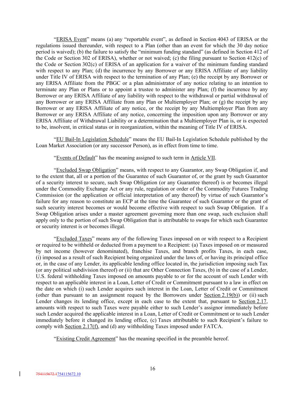 “ERISA Event” means (a) any “reportable event”, as defined in Section 4043 of ERISA or the regulations issued thereunder, with respect to a Plan (other than an event for which the 30 day notice period is waived); (b) the failure to satisfy the “minimum funding standard” (as defined in Section 412 of the Code or Section 302 of ERISA), whether or not waived; (c) the filing pursuant to Section 412(c) of the Code or Section 302(c) of ERISA of an application for a waiver of the minimum funding standard with respect to any Plan; (d) the incurrence by any Borrower or any ERISA Affiliate of any liability under Title IV of ERISA with respect to the termination of any Plan; (e) the receipt by any Borrower or any ERISA Affiliate from the PBGC or a plan administrator of any notice relating to an intention to terminate any Plan or Plans or to appoint a trustee to administer any Plan; (f) the incurrence by any Borrower or any ERISA Affiliate of any liability with respect to the withdrawal or partial withdrawal of any Borrower or any ERISA Affiliate from any Plan or Multiemployer Plan; or (g) the receipt by any Borrower or any ERISA Affiliate of any notice, or the receipt by any Multiemployer Plan from any Borrower or any ERISA Affiliate of any notice, concerning the imposition upon any Borrower or any ERISA Affiliate of Withdrawal Liability or a determination that a Multiemployer Plan is, or is expected to be, insolvent, in critical status or in reorganization, within the meaning of Title IV of ERISA. “EU Bail-In Legislation Schedule” means the EU Bail-In Legislation Schedule published by the Loan Market Association (or any successor Person), as in effect from time to time. “Events of Default” has the meaning assigned to such term in Article VII. “Excluded Swap Obligation” means, with respect to any Guarantor, any Swap Obligation if, and to the extent that, all or a portion of the Guarantee of such Guarantor of, or the grant by such Guarantor of a security interest to secure, such Swap Obligation (or any Guarantee thereof) is or becomes illegal under the Commodity Exchange Act or any rule, regulation or order of the Commodity Futures Trading Commission (or the application or official interpretation of any thereof) by virtue of such Guarantor’s failure for any reason to constitute an ECP at the time the Guarantee of such Guarantor or the grant of such security interest becomes or would become effective with respect to such Swap Obligation. If a Swap Obligation arises under a master agreement governing more than one swap, such exclusion shall apply only to the portion of such Swap Obligation that is attributable to swaps for which such Guarantee or security interest is or becomes illegal. “Excluded Taxes” means any of the following Taxes imposed on or with respect to a Recipient or required to be withheld or deducted from a payment to a Recipient: (a) Taxes imposed on or measured by net income (however denominated), franchise Taxes, and branch profits Taxes, in each case, (i) imposed as a result of such Recipient being organized under the laws of, or having its principal office or, in the case of any Lender, its applicable lending office located in, the jurisdiction imposing such Tax (or any political subdivision thereof) or (ii) that are Other Connection Taxes, (b) in the case of a Lender, U.S. federal withholding Taxes imposed on amounts payable to or for the account of such Lender with respect to an applicable interest in a Loan, Letter of Credit or Commitment pursuant to a law in effect on the date on which (i) such Lender acquires such interest in the Loan, Letter of Credit or Commitment (other than pursuant to an assignment request by the Borrowers under Section 2.19(b)) or (ii) such Lender changes its lending office, except in each case to the extent that, pursuant to Section 2.17, amounts with respect to such Taxes were payable either to such Lender’s assignor immediately before such Lender acquired the applicable interest in a Loan, Letter of Credit or Commitment or to such Lender immediately before it changed its lending office, (c) Taxes attributable to such Recipient’s failure to comply with Section 2.17(f), and (d) any withholding Taxes imposed under FATCA. “Existing Credit Agreement” has the meaning specified in the preamble hereof. 16 754115672.1754115672.10
