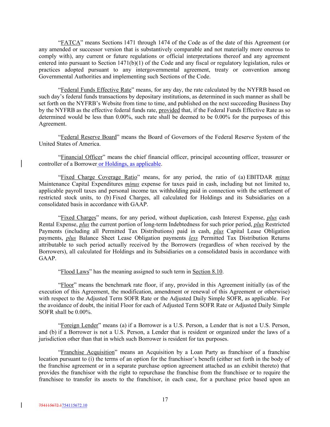 “FATCA” means Sections 1471 through 1474 of the Code as of the date of this Agreement (or any amended or successor version that is substantively comparable and not materially more onerous to comply with), any current or future regulations or official interpretations thereof and any agreement entered into pursuant to Section 1471(b)(1) of the Code and any fiscal or regulatory legislation, rules or practices adopted pursuant to any intergovernmental agreement, treaty or convention among Governmental Authorities and implementing such Sections of the Code. “Federal Funds Effective Rate” means, for any day, the rate calculated by the NYFRB based on such day’s federal funds transactions by depositary institutions, as determined in such manner as shall be set forth on the NYFRB’s Website from time to time, and published on the next succeeding Business Day by the NYFRB as the effective federal funds rate, provided that, if the Federal Funds Effective Rate as so determined would be less than 0.00%, such rate shall be deemed to be 0.00% for the purposes of this Agreement. “Federal Reserve Board” means the Board of Governors of the Federal Reserve System of the United States of America. “Financial Officer” means the chief financial officer, principal accounting officer, treasurer or controller of a Borrower or Holdings, as applicable. “Fixed Charge Coverage Ratio” means, for any period, the ratio of (a) EBITDAR minus Maintenance Capital Expenditures minus expense for taxes paid in cash, including but not limited to, applicable payroll taxes and personal income tax withholding paid in connection with the settlement of restricted stock units, to (b) Fixed Charges, all calculated for Holdings and its Subsidiaries on a consolidated basis in accordance with GAAP. “Fixed Charges” means, for any period, without duplication, cash Interest Expense, plus cash Rental Expense, plus the current portion of long-term Indebtedness for such prior period, plus Restricted Payments (including all Permitted Tax Distributions) paid in cash, plus Capital Lease Obligation payments, plus Balance Sheet Lease Obligation payments less Permitted Tax Distribution Returns attributable to such period actually received by the Borrowers (regardless of when received by the Borrowers), all calculated for Holdings and its Subsidiaries on a consolidated basis in accordance with GAAP. “Flood Laws” has the meaning assigned to such term in Section 8.10. “Floor” means the benchmark rate floor, if any, provided in this Agreement initially (as of the execution of this Agreement, the modification, amendment or renewal of this Agreement or otherwise) with respect to the Adjusted Term SOFR Rate or the Adjusted Daily Simple SOFR, as applicable. For the avoidance of doubt, the initial Floor for each of Adjusted Term SOFR Rate or Adjusted Daily Simple SOFR shall be 0.00%. “Foreign Lender” means (a) if a Borrower is a U.S. Person, a Lender that is not a U.S. Person, and (b) if a Borrower is not a U.S. Person, a Lender that is resident or organized under the laws of a jurisdiction other than that in which such Borrower is resident for tax purposes. “Franchise Acquisition” means an Acquisition by a Loan Party as franchisor of a franchise location pursuant to (i) the terms of an option for the franchisor’s benefit (either set forth in the body of the franchise agreement or in a separate purchase option agreement attached as an exhibit thereto) that provides the franchisor with the right to repurchase the franchise from the franchisee or to require the franchisee to transfer its assets to the franchisor, in each case, for a purchase price based upon an 17 754115672.1754115672.10