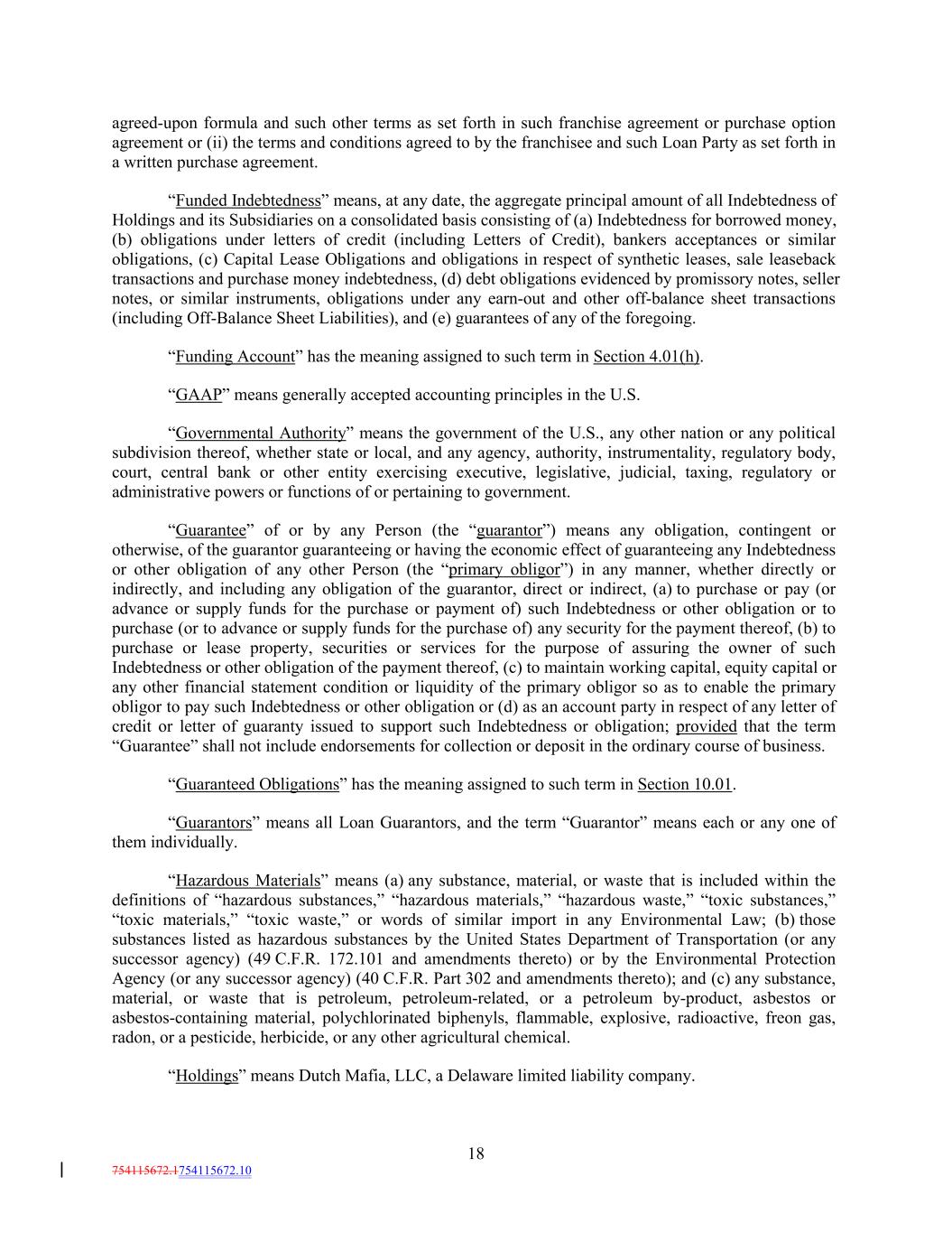 agreed-upon formula and such other terms as set forth in such franchise agreement or purchase option agreement or (ii) the terms and conditions agreed to by the franchisee and such Loan Party as set forth in a written purchase agreement. “Funded Indebtedness” means, at any date, the aggregate principal amount of all Indebtedness of Holdings and its Subsidiaries on a consolidated basis consisting of (a) Indebtedness for borrowed money, (b) obligations under letters of credit (including Letters of Credit), bankers acceptances or similar obligations, (c) Capital Lease Obligations and obligations in respect of synthetic leases, sale leaseback transactions and purchase money indebtedness, (d) debt obligations evidenced by promissory notes, seller notes, or similar instruments, obligations under any earn-out and other off-balance sheet transactions (including Off-Balance Sheet Liabilities), and (e) guarantees of any of the foregoing. “Funding Account” has the meaning assigned to such term in Section 4.01(h). “GAAP” means generally accepted accounting principles in the U.S. “Governmental Authority” means the government of the U.S., any other nation or any political subdivision thereof, whether state or local, and any agency, authority, instrumentality, regulatory body, court, central bank or other entity exercising executive, legislative, judicial, taxing, regulatory or administrative powers or functions of or pertaining to government. “Guarantee” of or by any Person (the “guarantor”) means any obligation, contingent or otherwise, of the guarantor guaranteeing or having the economic effect of guaranteeing any Indebtedness or other obligation of any other Person (the “primary obligor”) in any manner, whether directly or indirectly, and including any obligation of the guarantor, direct or indirect, (a) to purchase or pay (or advance or supply funds for the purchase or payment of) such Indebtedness or other obligation or to purchase (or to advance or supply funds for the purchase of) any security for the payment thereof, (b) to purchase or lease property, securities or services for the purpose of assuring the owner of such Indebtedness or other obligation of the payment thereof, (c) to maintain working capital, equity capital or any other financial statement condition or liquidity of the primary obligor so as to enable the primary obligor to pay such Indebtedness or other obligation or (d) as an account party in respect of any letter of credit or letter of guaranty issued to support such Indebtedness or obligation; provided that the term “Guarantee” shall not include endorsements for collection or deposit in the ordinary course of business. “Guaranteed Obligations” has the meaning assigned to such term in Section 10.01. “Guarantors” means all Loan Guarantors, and the term “Guarantor” means each or any one of them individually. “Hazardous Materials” means (a) any substance, material, or waste that is included within the definitions of “hazardous substances,” “hazardous materials,” “hazardous waste,” “toxic substances,” “toxic materials,” “toxic waste,” or words of similar import in any Environmental Law; (b) those substances listed as hazardous substances by the United States Department of Transportation (or any successor agency) (49 C.F.R. 172.101 and amendments thereto) or by the Environmental Protection Agency (or any successor agency) (40 C.F.R. Part 302 and amendments thereto); and (c) any substance, material, or waste that is petroleum, petroleum-related, or a petroleum by-product, asbestos or asbestos-containing material, polychlorinated biphenyls, flammable, explosive, radioactive, freon gas, radon, or a pesticide, herbicide, or any other agricultural chemical. “Holdings” means Dutch Mafia, LLC, a Delaware limited liability company. 18 754115672.1754115672.10